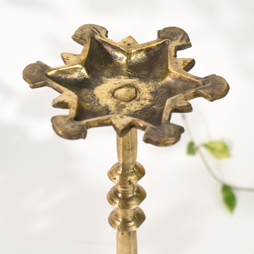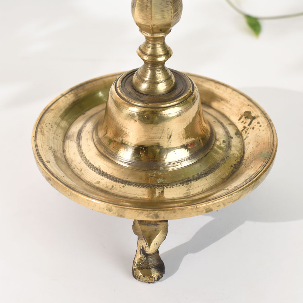 Elevate your home decor with this vintage brass oil lamp stand inspired by traditional South Indian art. Crafted with a tall, elegant stem and a beautifully shaped diya holder, this lamp stand showcases the timeless charm of temple-style craftsmanship. The base is designed with sturdy ornamental legs, offering excellent balance while adding a distinct antique appeal. Handmade from solid brass, it features a warm golden patina that enhances its heritage look, making it an ideal choice for pooja rooms, spiritual corners, or cultural interior styling. Whether used during rituals or displayed as a collectors piece, it brings an aura of devotion and artistry to any setting.