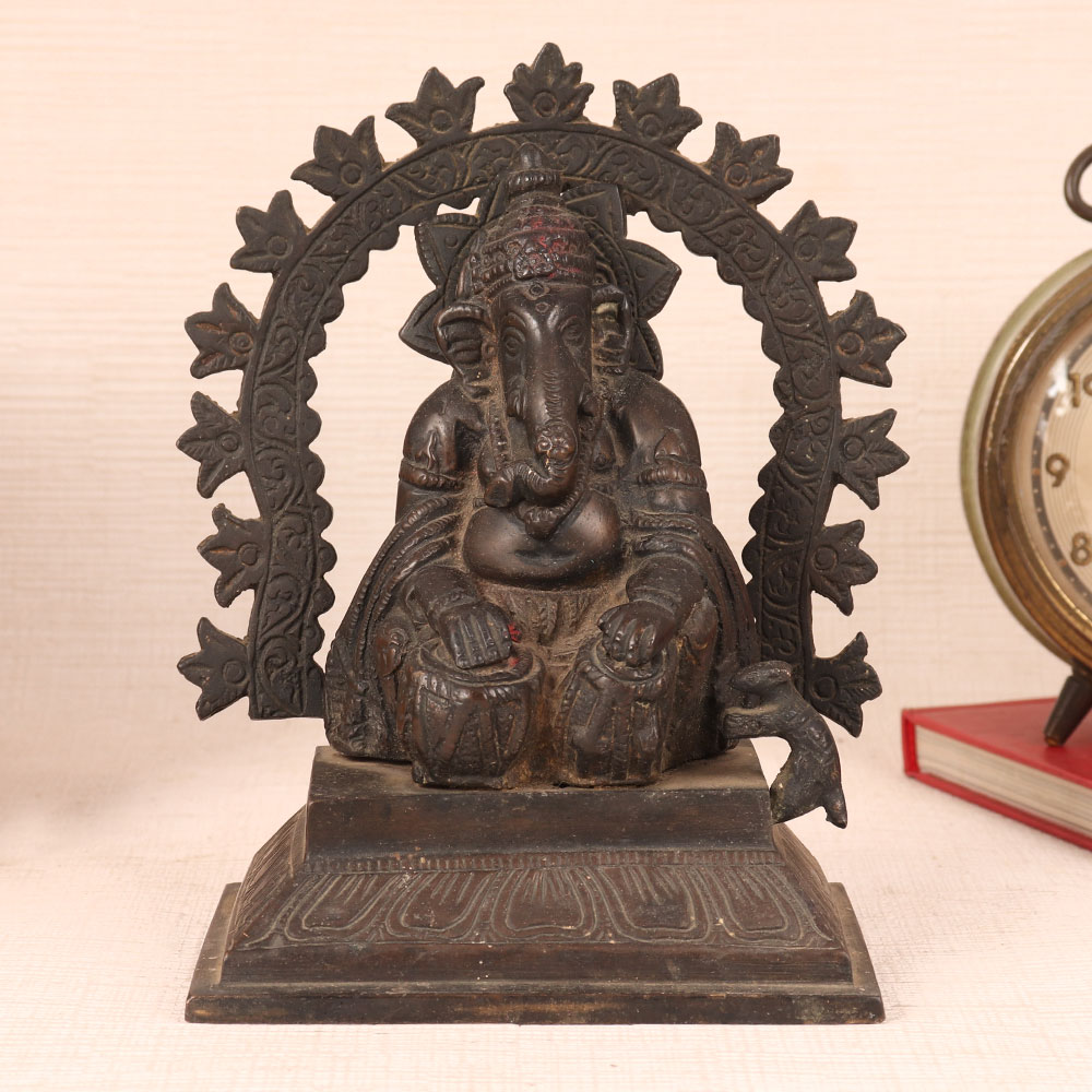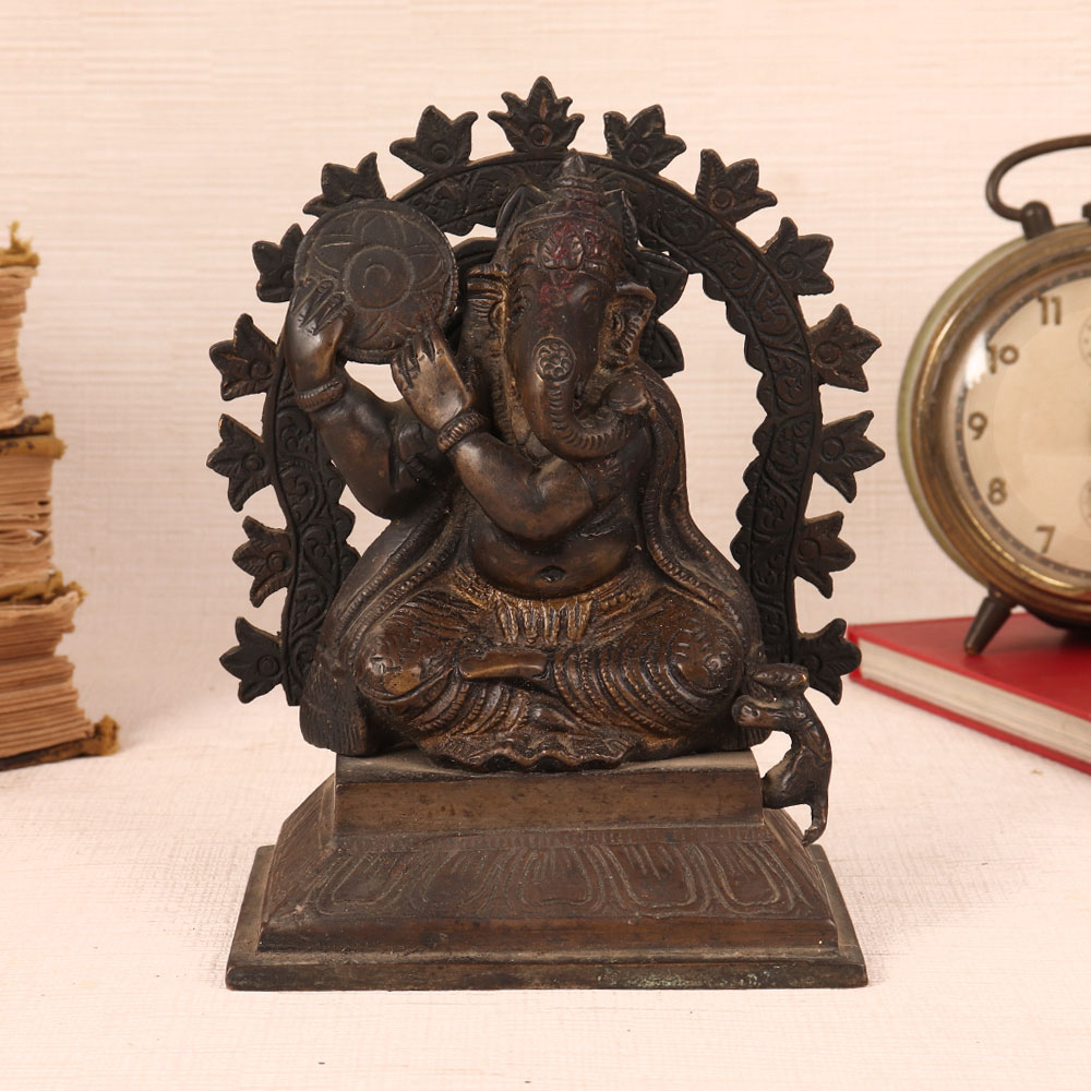 A set of four vintage brass statues, each portraying Lord Ganesha in a unique musical avatar. Crafted with precision by talented Indian artisans, these statues stand as a testament to the rich cultural heritage and craftsmanship of India. Cast in high-quality brass and finished in an antique brown patina, they exude an aura of timeless elegance. Lord Ganesha, the beloved Hindu deity known as the remover of obstacles and the patron of arts and sciences, is depicted here in four distinct forms, playing different musical instruments. These statues capture the essence of divine creativity, with Ganesha gracefully playing bongo drums, tapping a Indian Drum, blowing a flute, and playing tambourine. This remarkable set is versatile, making it suitable for a variety of settings. Whether adorning your home, office, restaurant, hotel, shop, cafe, or prayer room, these statues bring an air of spirituality and artistic grace to any space. They are ideal for collectors of vintage treasures, as well as for showcasing at exhibitions. Moreover, these statues make for a thoughtful and meaningful gift. Share the blessings of Lord Ganesha with your family, friends or relatives on special, festive, or auspicious occasions.