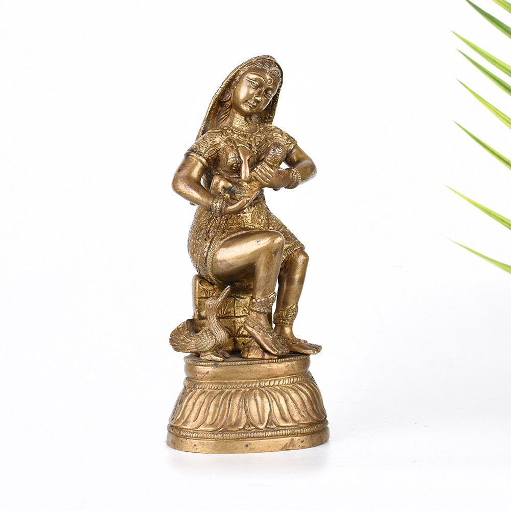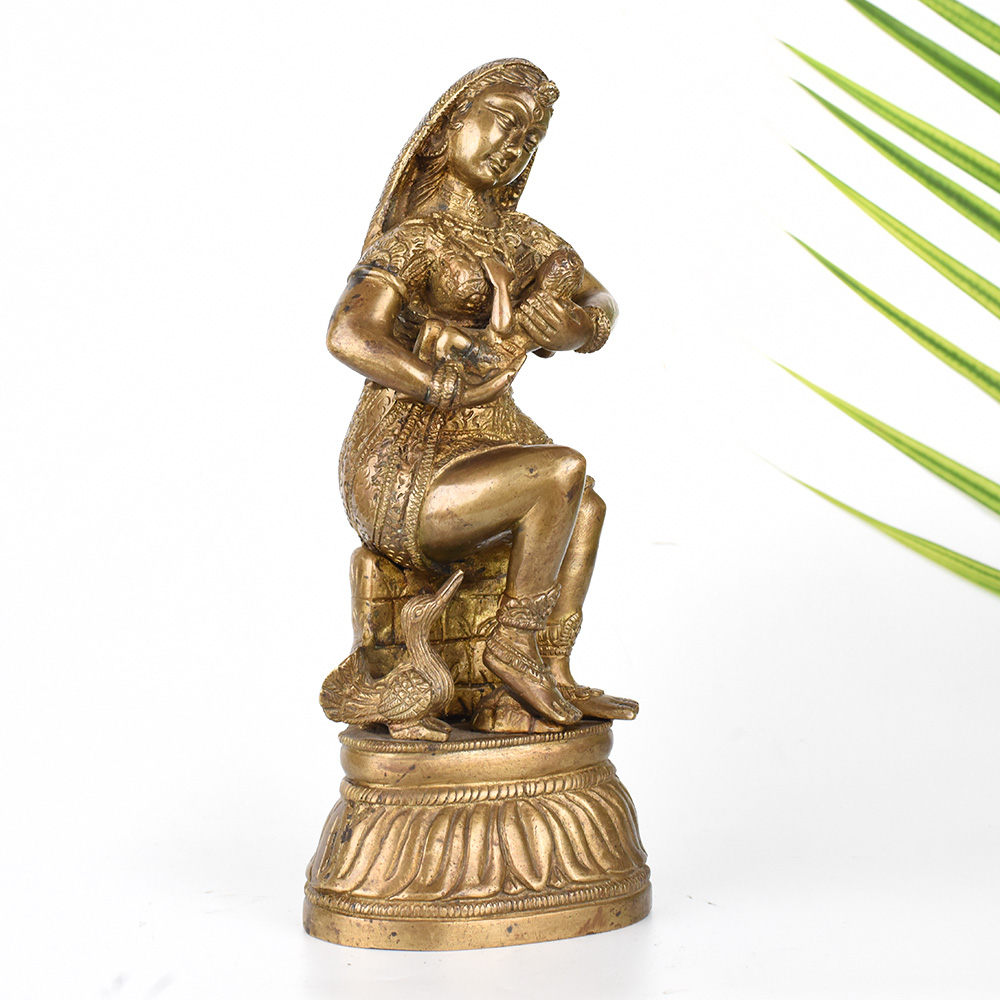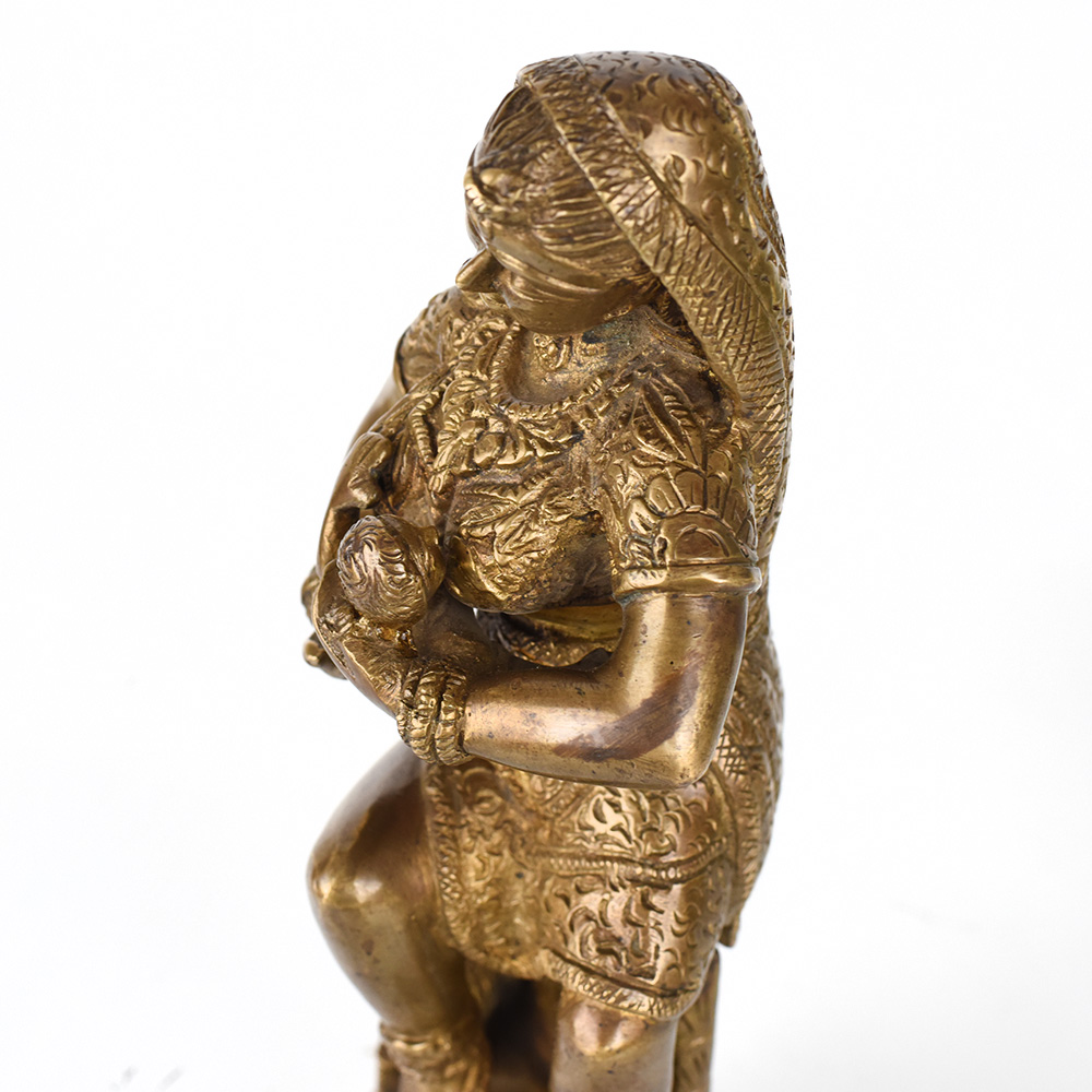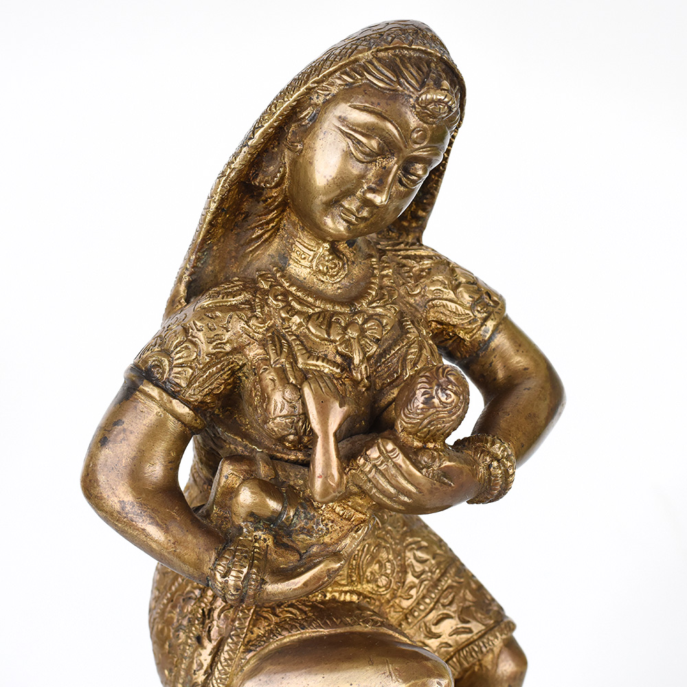 Gaze upon the divine bond between mother and child with this exquisite vintage brass statue. Witness the tender, loving care of Krishna's mother as she tenderly feeds her divine son. This breathtaking statue is a window into the profound spiritual connection between the mother of Lord Krishna and her beloved son. The intricate details and expert craftsmanship bring this sacred moment to life, allowing you to feel the depth of a mother's devotion. Display this statue in your prayer room or meditation space to cultivate a sense of reverence, love, and spiritual nourishment. It also makes a cherished gift for Hindu holidays, housewarming celebrations, or to honor important life events. Gaze upon this statue and let it inspire you to nurture the divine within yourself and those you love.