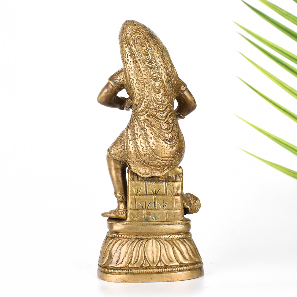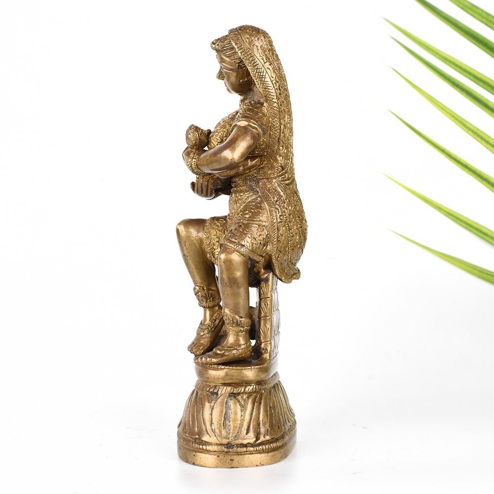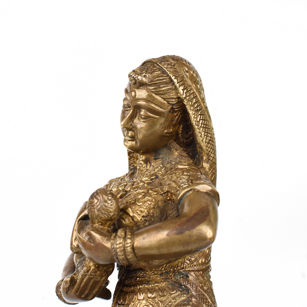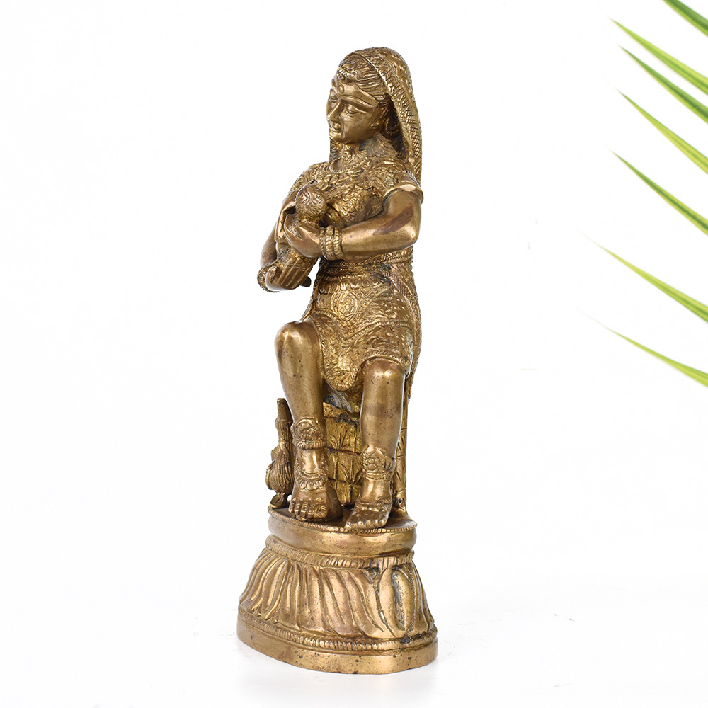 Gaze upon the divine bond between mother and child with this exquisite vintage brass statue. Witness the tender, loving care of Krishna's mother as she tenderly feeds her divine son. This breathtaking statue is a window into the profound spiritual connection between the mother of Lord Krishna and her beloved son. The intricate details and expert craftsmanship bring this sacred moment to life, allowing you to feel the depth of a mother's devotion. Display this statue in your prayer room or meditation space to cultivate a sense of reverence, love, and spiritual nourishment. It also makes a cherished gift for Hindu holidays, housewarming celebrations, or to honor important life events. Gaze upon this statue and let it inspire you to nurture the divine within yourself and those you love.