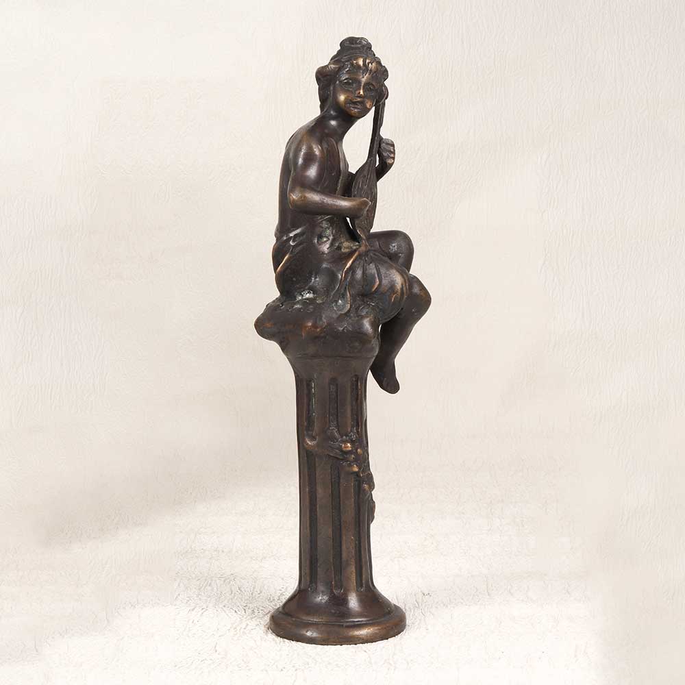 Let the sweet strains of the sarangi fill your home with this vintage brass statue depicting a classically styled musician. His eyes closed in meditative focus, and his talented fingers pluck the strings, creating a soothing, atmospheric melody. This finely detailed statue masterfully replicates the lost arts of generations past. For those looking to add old-world character to their home, this sarangi player statue hits all the right notes. The vintage styling will impress guests and provide a relaxing ambiance. Perfect for music lovers who appreciate the craftsmanship of traditional folk instruments. Place it on a console table, bookshelf, or curio cabinet to add a whisper of the past. With its ornate detailing and aged patina, this brass statue celebrates the talents of old-world street musicians. The serene focus and energy of the player add a soothing, welcoming vibe. Let this vintage brass sarangi maestro fill your home with good vibes and beautiful music.
