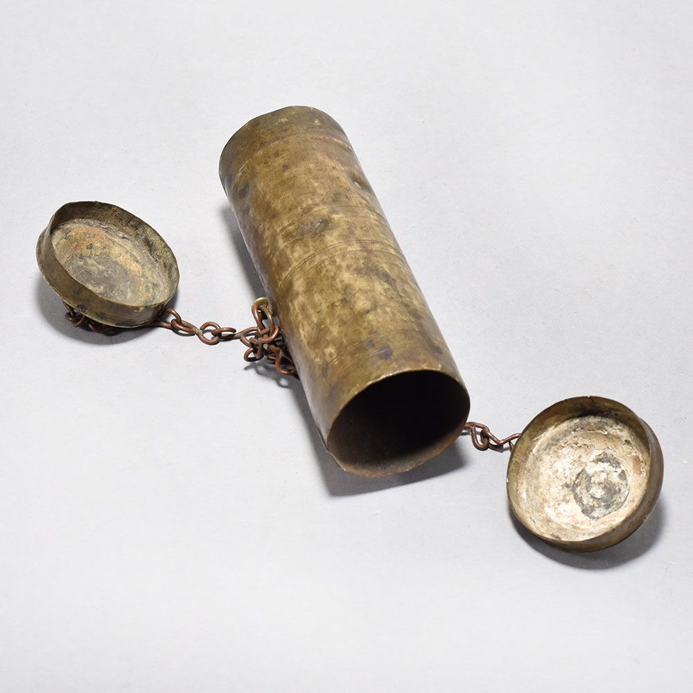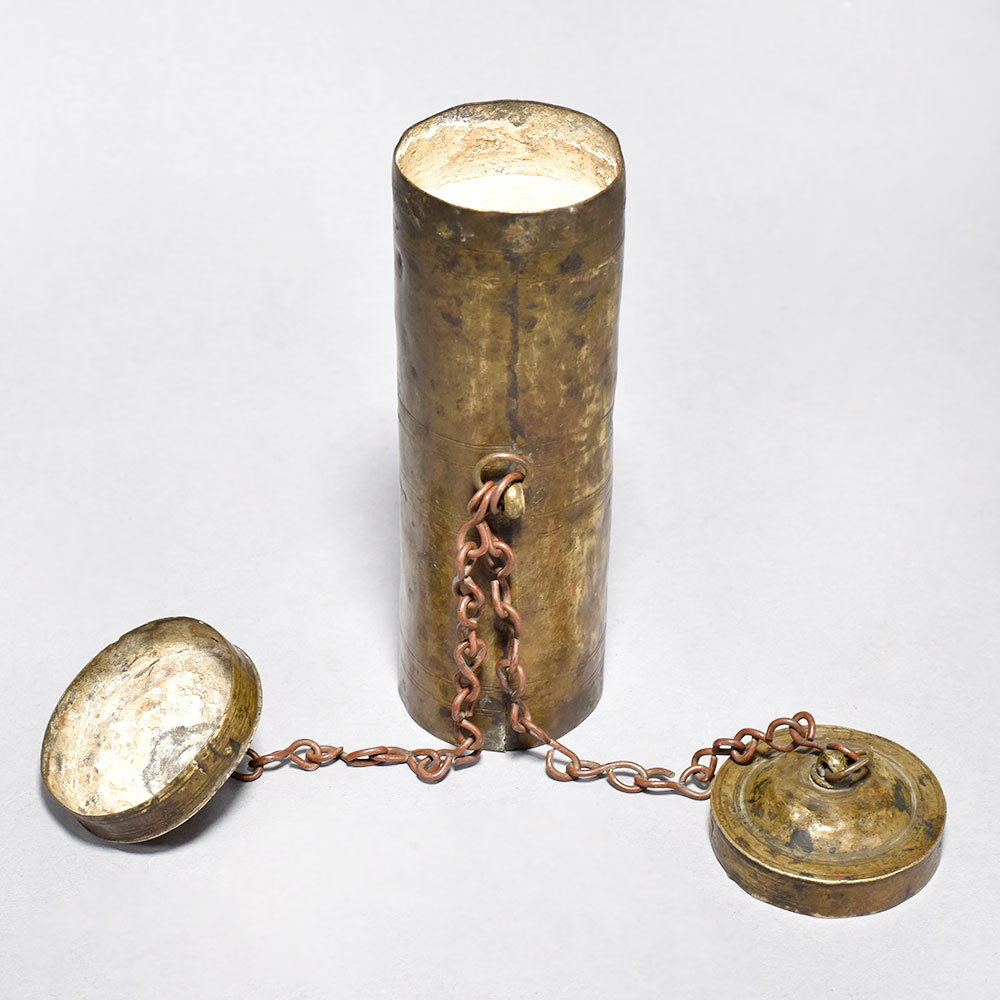 Discover the allure of ancient Indian craftsmanship with this vintage brass tobacco and lime pot.This antique brass pot is a testament to the skilled artisanry of Central India. Imagine holding this tactile treasure, tracing its intricate patterns, and feeling connected to centuries of cultural tradition. Whether you choose to use it for its original purpose or simply admire it as a work of art, this pot will elevate any space with its timeless beauty and unique history. Bring the intriguing essence of the past into your modern-day rituals and decor. Crafted from solid brass in a classic cylindrical shape Hinged lid and hanging chain for functional elegance Historically used to store tobacco and lime for oral care Captivating piece to display or incorporate into your rituals This unique handcrafted piece is a testament to traditional artistry, blending functionality with beauty and making it a treasured collectible for years to come.