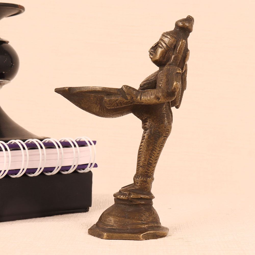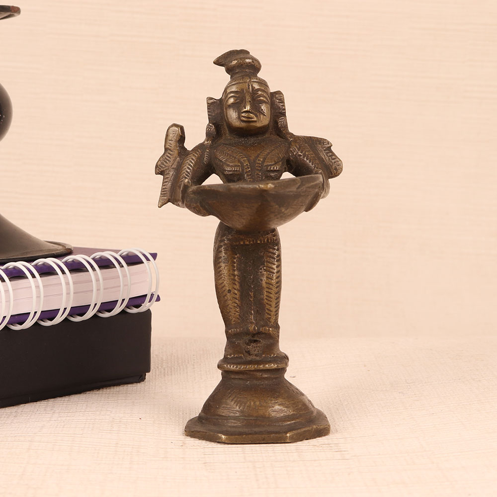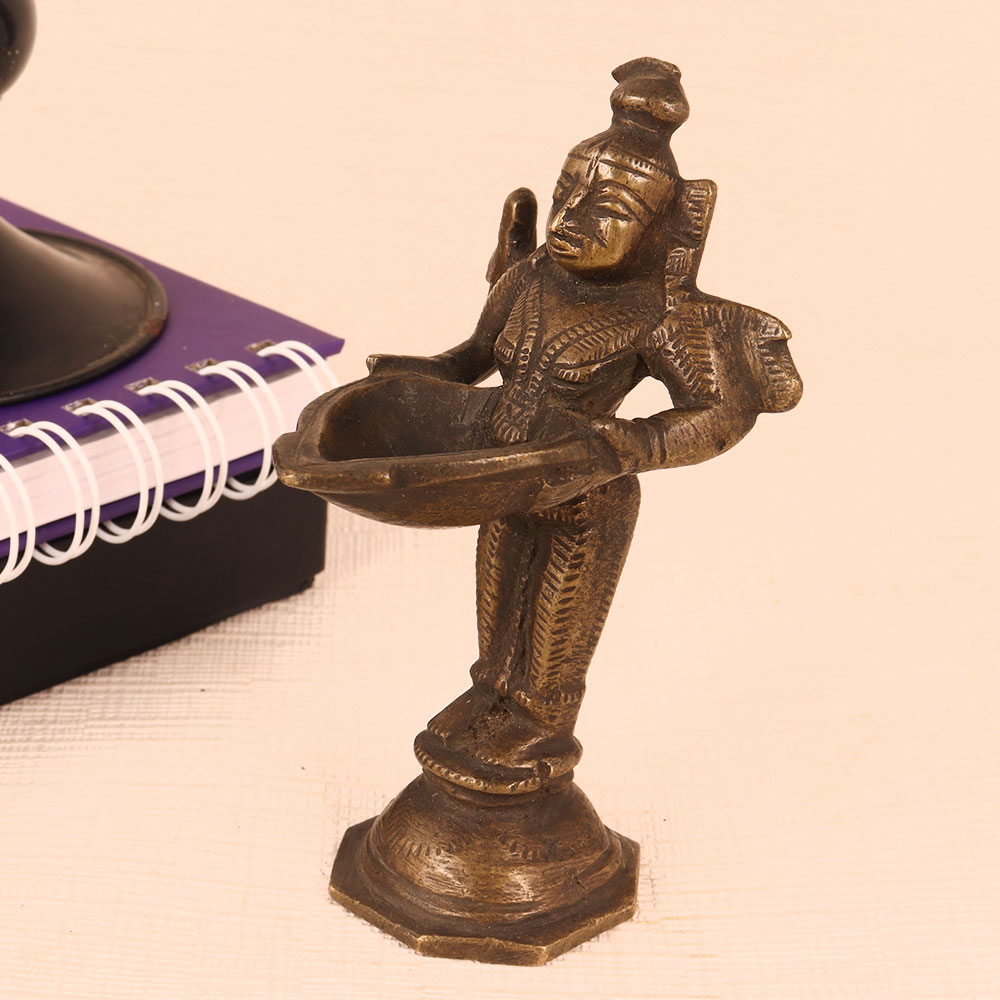 Buy a DeepLaxmi Brass Statue online in a captivating vintage brown finish that is a masterpiece meticulously handcrafted by highly talented Indian craftsmen. Crafted from the finest quality brass, this statue exudes elegance and cultural richness, making it a cherished addition to your surroundings. Standing as a symbol of prosperity and divinity, DeepLaxmi, with her intricate detailing and graceful form, adds a touch of spiritual sanctity to any space. Whether it's your home, office, restaurant, hotel, cafe, or shop, this statue creates a serene ambiance, ideal for prayer rooms or as a captivating decorative piece. The DeepLaxmi Brass Statue not only enhances the aesthetics of your environment but also brings positivity. Illuminate it with traditional mustard oil or ghee, using a cotton wick, to radiate a warm, inviting glow, symbolizing the dispelling of darkness and the ushering in of light and blessings. For collectors of vintage treasures, this statue is a must-have, blending tradition with timeless beauty. It also makes a thoughtful gift for your family, friends or relatives during special, festive, or auspicious occasions, conveying your heartfelt wishes for their prosperity and happiness.