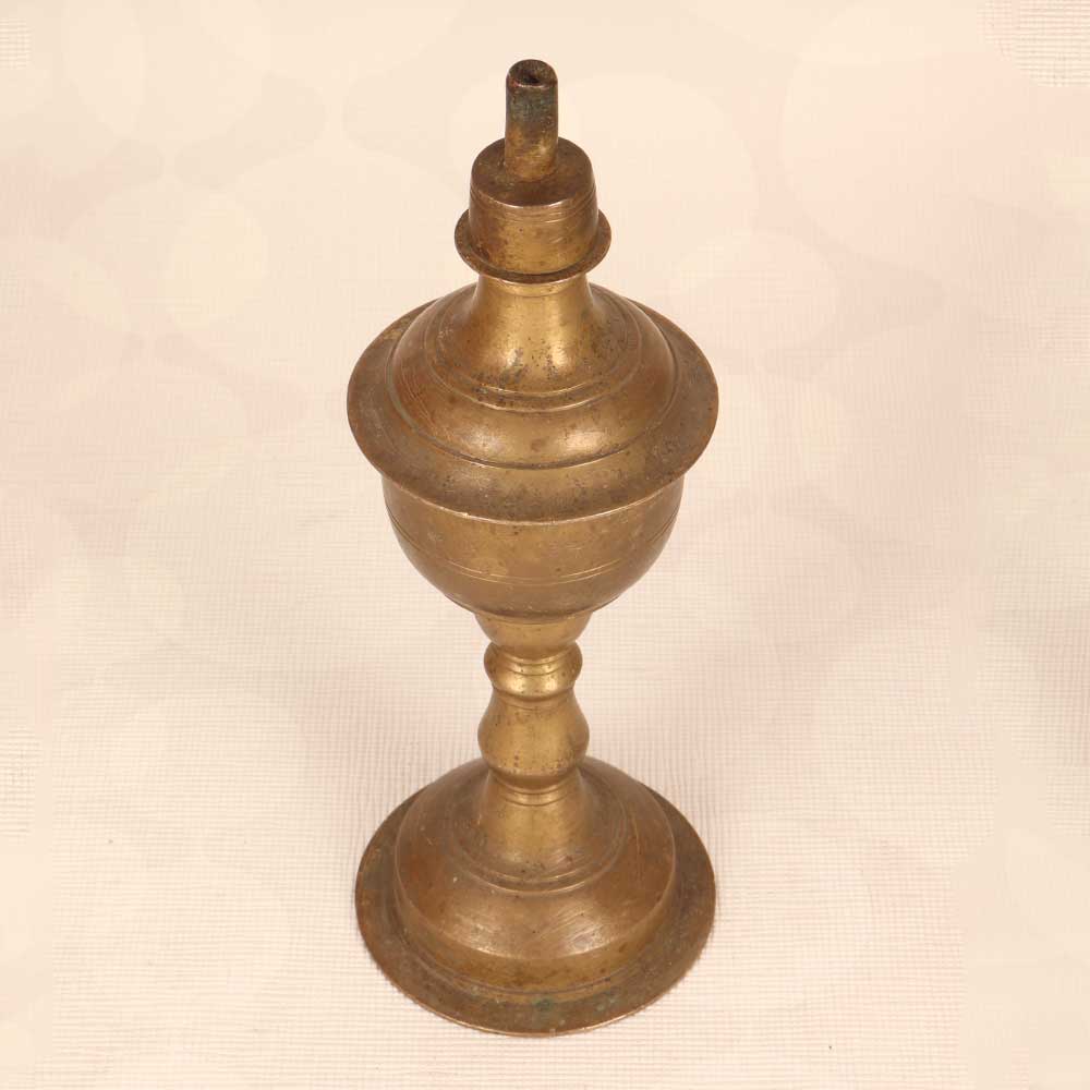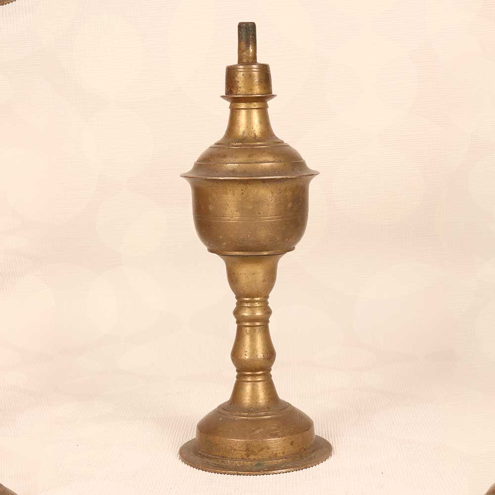 Bask in the warm, welcoming glow of this antique brass oil lamp, handcrafted in the artistic tradition of Gujarat, India. Intricate embossing recalls patterns passed down through generations. Gather with friends and family around this lamp's romantic light. Perfect for cozy dinners, intimate conversations, or just spending time together. The soft, golden glow sets the mood for relaxation and connection. Ideal for the globally inspired home. This beautiful, heirloom-quality lamp infuses spaces with historic charm and cultural flair. A treasure to pass down, evoking memories of far-off places. Let its dancing flame transport you.