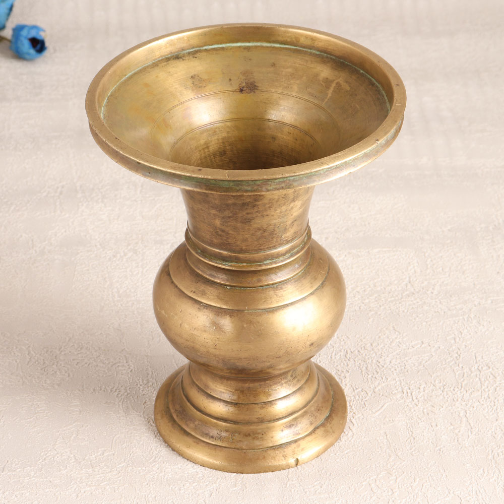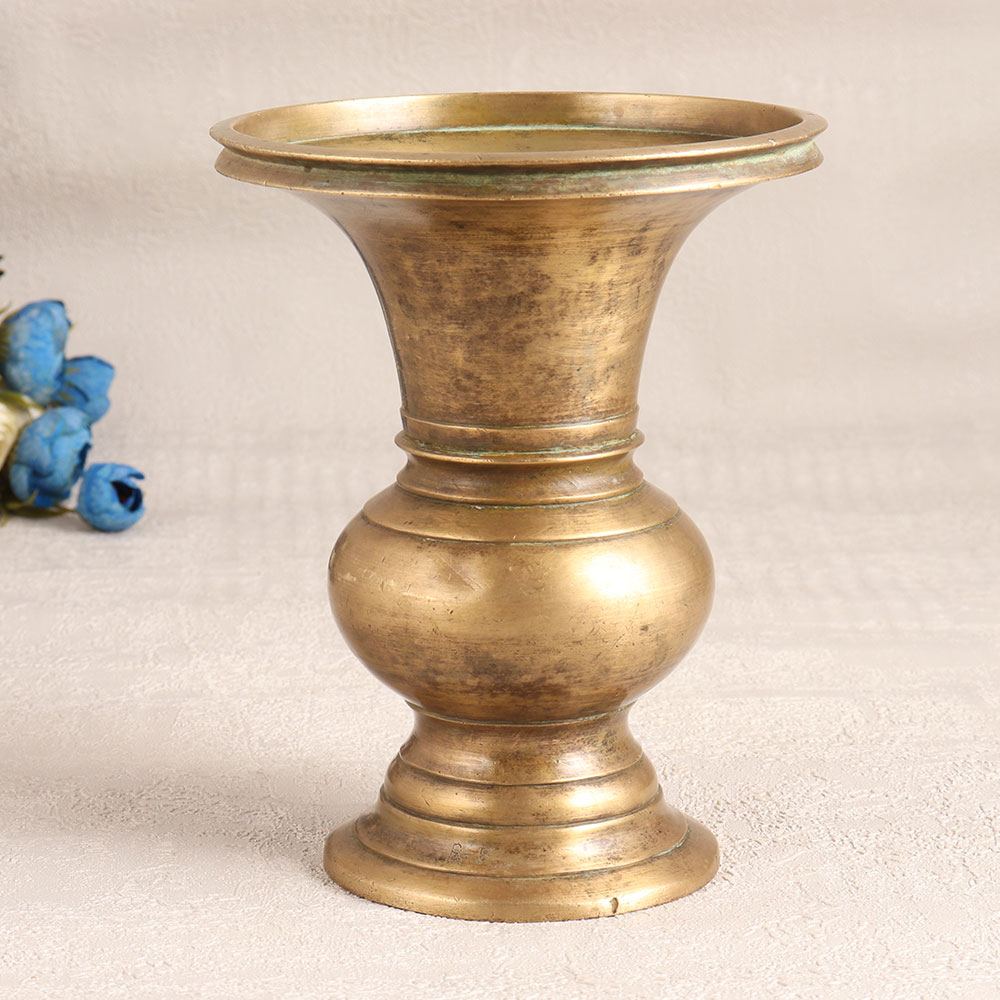 Buy a Vintage Brass Flower Pot online from our website and get a hassle free delivery at your doorstep. Handcrafted by highly skilled Indian craftsmen in the rich tradition of South Indian Art, this exquisite piece exudes the charm of a bygone era. Its antique brown finish adds a touch of rustic allure, making it the perfect addition to any interior setting. Crafted from high-quality brass, this flower pot not only boasts durability but also radiates a warm, vintage allure. Its small size makes it versatile, allowing you to adorn your home, office, hotel, cafe, shop, or restaurant with a touch of antique sophistication. Whether you place it on a table top, a window sill, or a mantle, it effortlessly enhances the ambiance. This stunning flower pot can also be a captivating addition to your vintage collection, adding a sense of history and nostalgia to your space. It's ideal for exhibition displays, creating a focal point that tells a story of Indian craftsmanship. As a thoughtful gift, it's a symbol of auspicious occasions and cherished moments. Share this masterpiece with your family, friends or relatives on special, festive, or celebratory events, and let them relish the timeless beauty of Indian artistry.