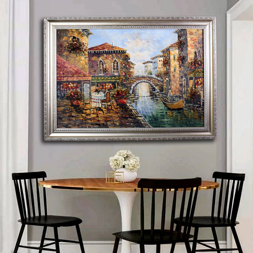 Escape the hustle and bustle of everyday life and immerse yourself in the tranquil beauty of the Venice City with this stunning vintage canvas oil painting. Crafted with meticulous attention to detail, this painting captures a serene landscape of a winding river, and charming houses, rendered in a palette of warm, earthy tones that radiate an old-world elegance. Whether you're a seasoned art collector or simply seeking to infuse your home with timeless charm, this painting is a must-have piece that will effortlessly elevate your decor. Its substantial size makes it a stunning focal point, and gallery-quality construction ensure it will be a treasured heirloom for generations to come. Imagine this captivating artwork hanging in your living room, drawing the eye and creating a cozy, inviting ambiance. Or picture it in your dining room, adding a touch of rustic sophistication to your meals. No matter where you choose to display it, this vintage canvas oil painting will transport you to a world of beauty and tranquility, reminding you to slow down and savor the simple pleasures in life.