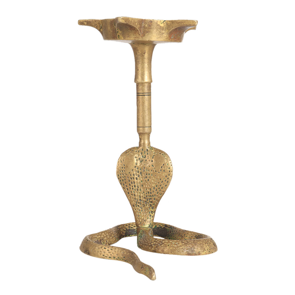 A charming oil lamp with cobra stand and 5 jyots, traditionally made of brass with ancient techniques. 5 jyots can be lit simultaneously with mustard oil or desi ghee and cotton wicks. Its sophisticated design would look great in your living room. It is a fantastic vintage gift to give your loved ones a special treat and an incredible item for their home or office. Add an antique touch to your restaurant, hotel or living room with this candle holder. Excellent addition for vintage art lovers to expand their collection.