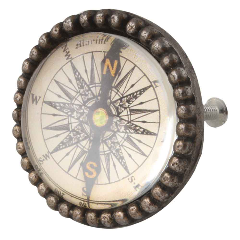 While the compass design speaks to vintage aesthetics, the clean round shape and minimalist glass top provide a modern edge. This combination of old-world charm and contemporary style makes the knob a versatile addition to any furniture, enhancing the look of any room with an effortlessly chic yet nostalgic feel.