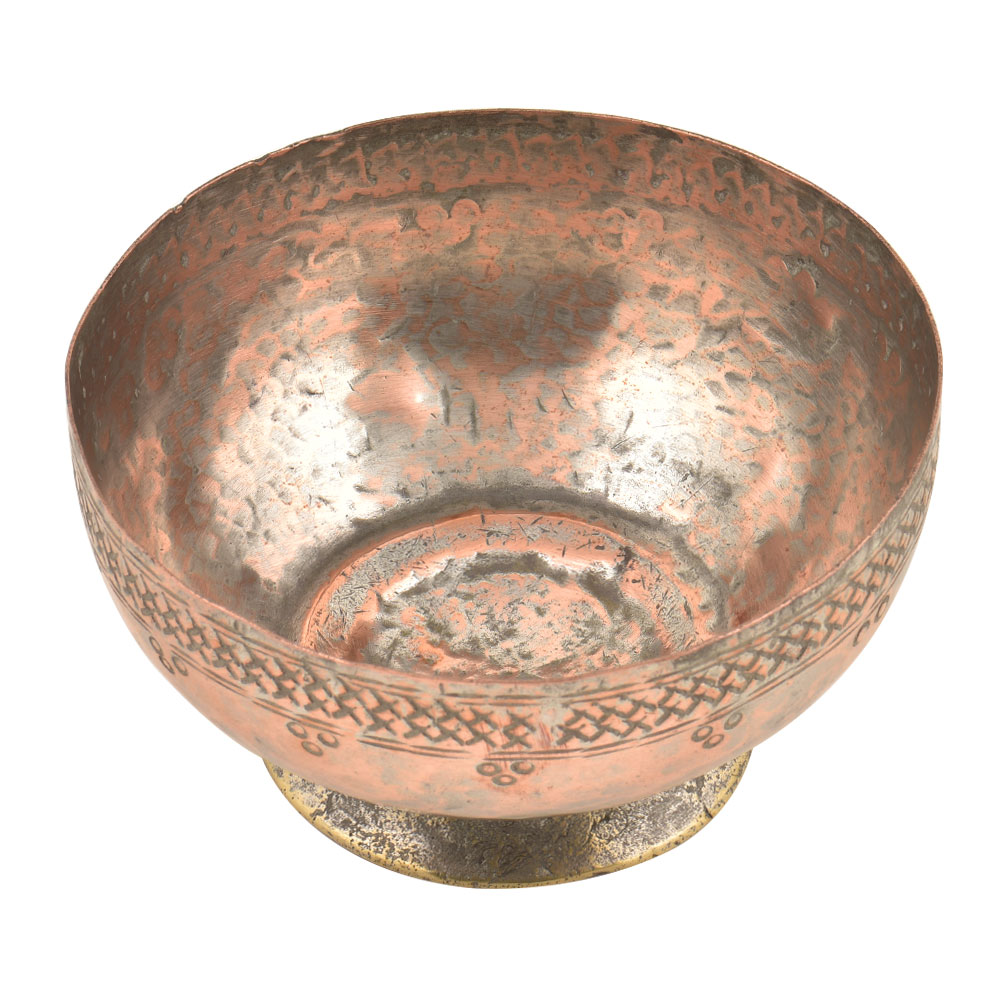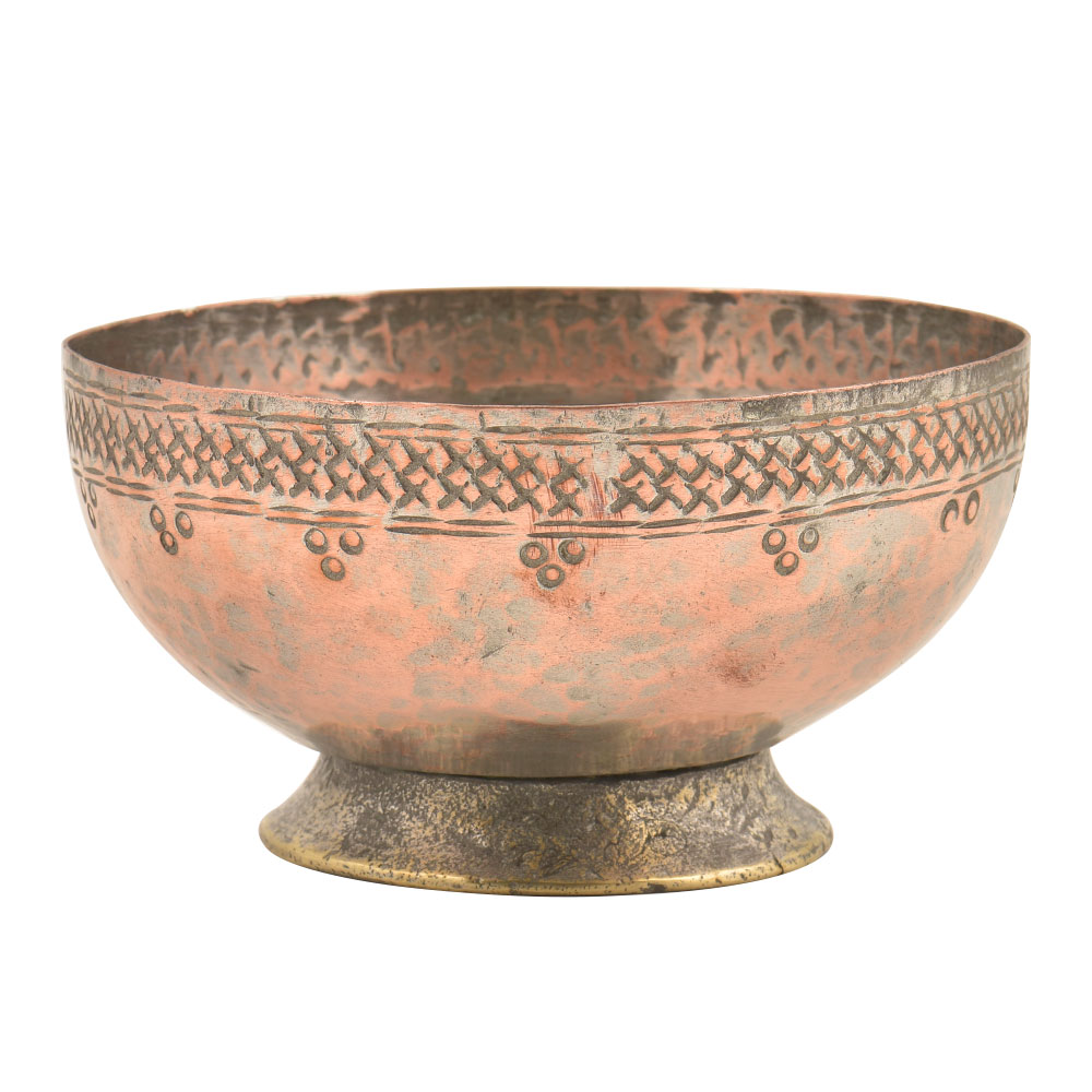 Here is a very elaborated Islamic style copper bowl most likely Persian style in origin Very detailed floral and geometrical decorations showing great craftsmanship with criss cross pattern on the rim of the bowl.The handmade copper bowl is made by expert craftsmen of India is very decorative, great display, it can be used as fruit or flower bowl.