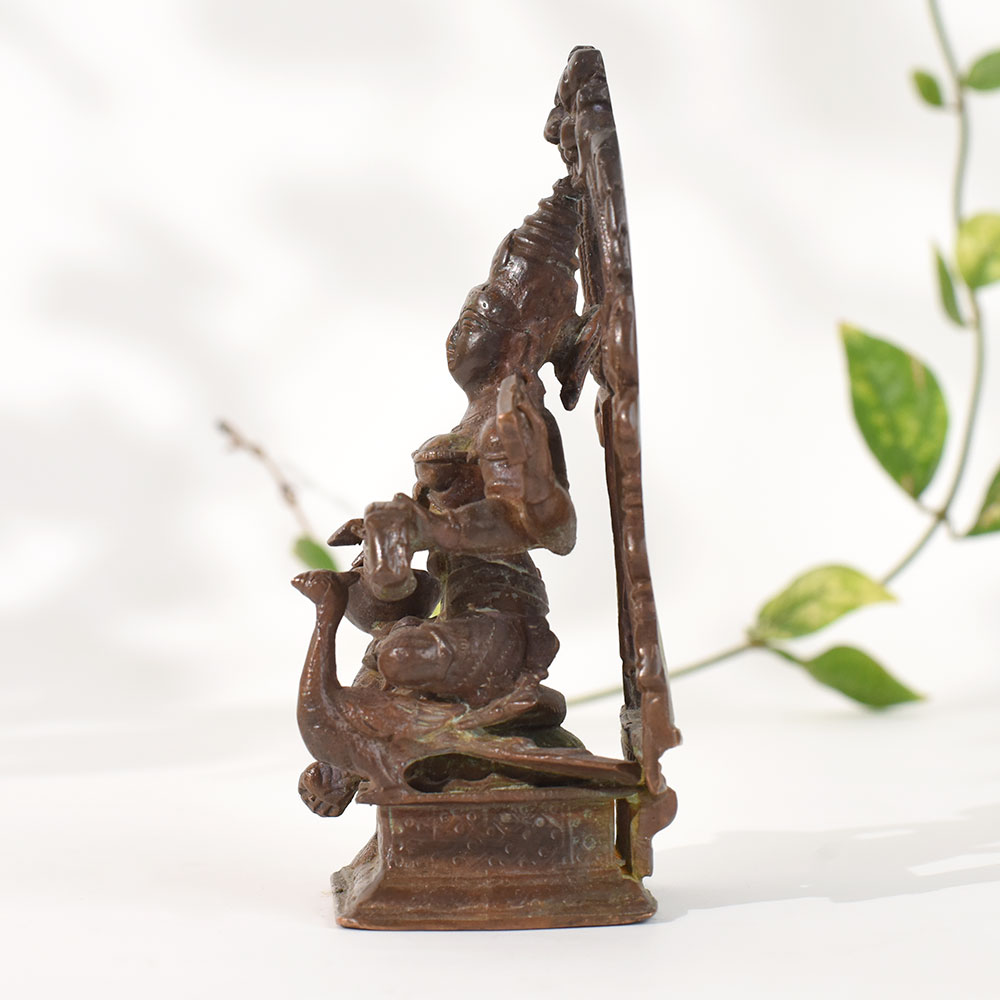 This vintage copper goddess Matangi statue beautifully captures the essence of divine feminine energy and classical Indian craftsmanship. The goddess is depicted in a seated posture, playing a traditional instrument, framed by an intricately carved arch that enhances the sculptures cultural richness. Crafted in solid copper, the idol features aged patina tones, giving it an authentic antique appearance that adds depth, heritage, and character to any space. Perfect for home temples, meditation corners, spiritual rooms, or curated vintage decor arrangements, this statue becomes a striking focal point. The fine detailing in the attire, ornaments, and facial expression highlights hand-crafted artistry, making it a meaningful collectible for lovers of traditional metal art. Whether used for daily worship, displayed as a decor statement, or gifted to someone who appreciates Indian heritage, this copper goddess statue brings serenity, cultural symbolism, and timeless beauty to any environment.