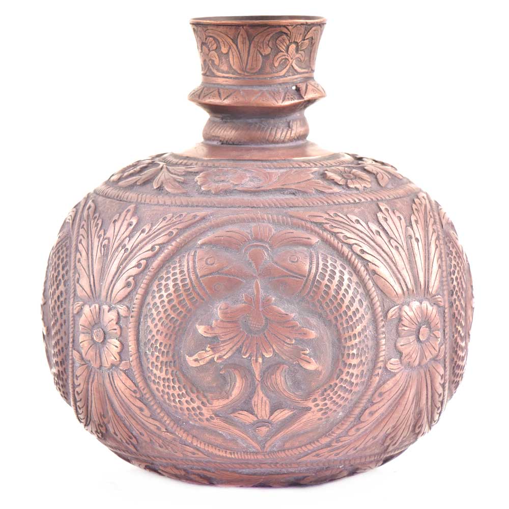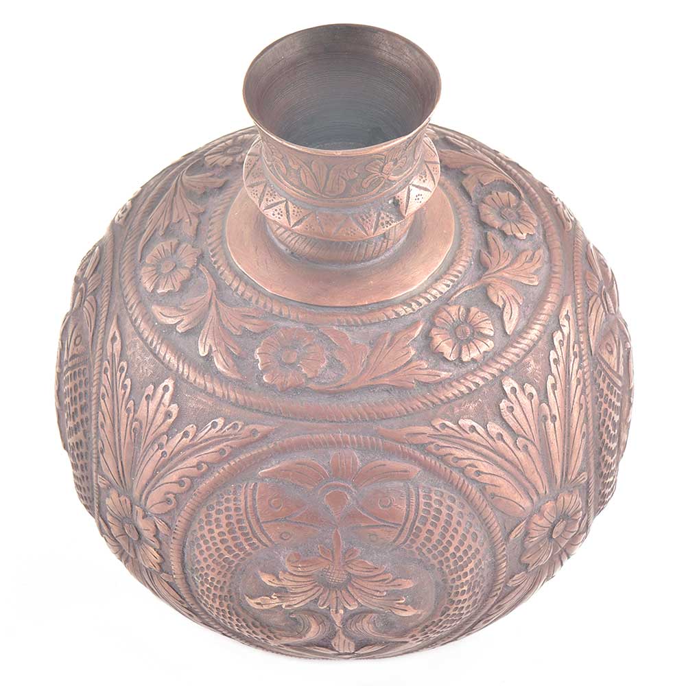 Copper Hookah Base of spherical form with slightly flared cylindrical neck rising through pronounced boss, the body engraved with leaves and fish design on the entire surface of the hookah base . The shoulder and neck has embossed leaves deign with vines that gives it a very vintage apearance.