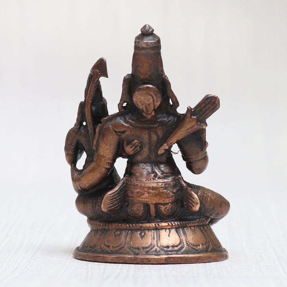 Buy a vintage copper statue of Lord Narayan with his beloved consort, Goddess Lakshmi. Handcrafted by talented Indian craftsmen using high-quality copper, this exquisite masterpiece captures the divine essence of these revered deities. Lord Narayan, also known as Lord Vishnu, is depicted in a seated posture, exuding an aura of tranquillity and serenity. Goddess Lakshmi graces his left lap, symbolizing abundance, prosperity, and beauty. This stunning Indian god statue is a perfect addition to your home, office, restaurant, hotel, or cafe temple. The statue's intricate craftsmanship and attention to detail make it ideal for collections, exhibitions, or simply as an ornamental centerpiece. This sacred artefact also serves as an auspicious gift for your family, friends or relatives on special, festive, or auspicious occasions, symbolizing blessings, luck, and divine protection. Explore our exclusive collection of Indian god statues and buy idols online to discover more divine treasures for your home temple.