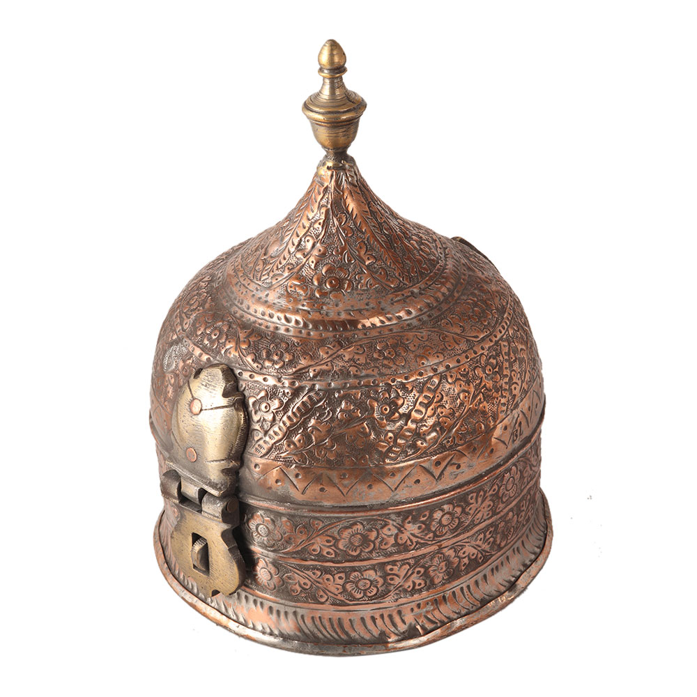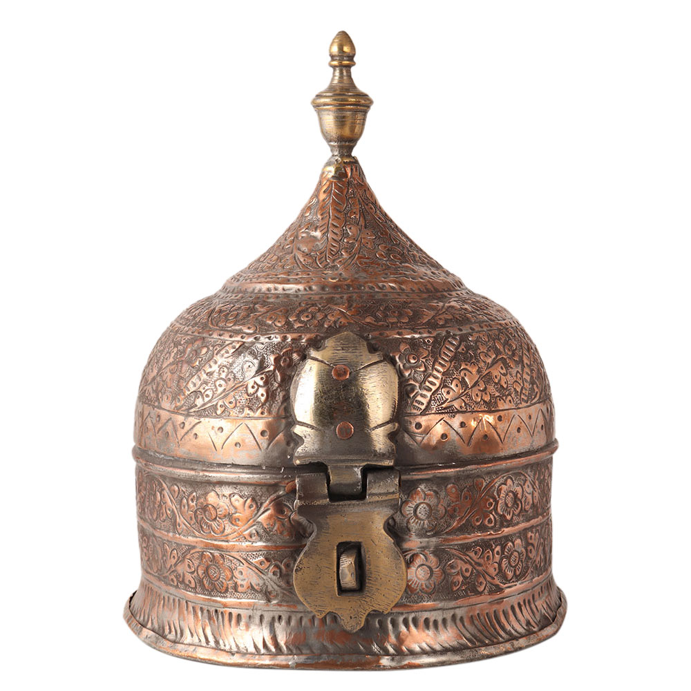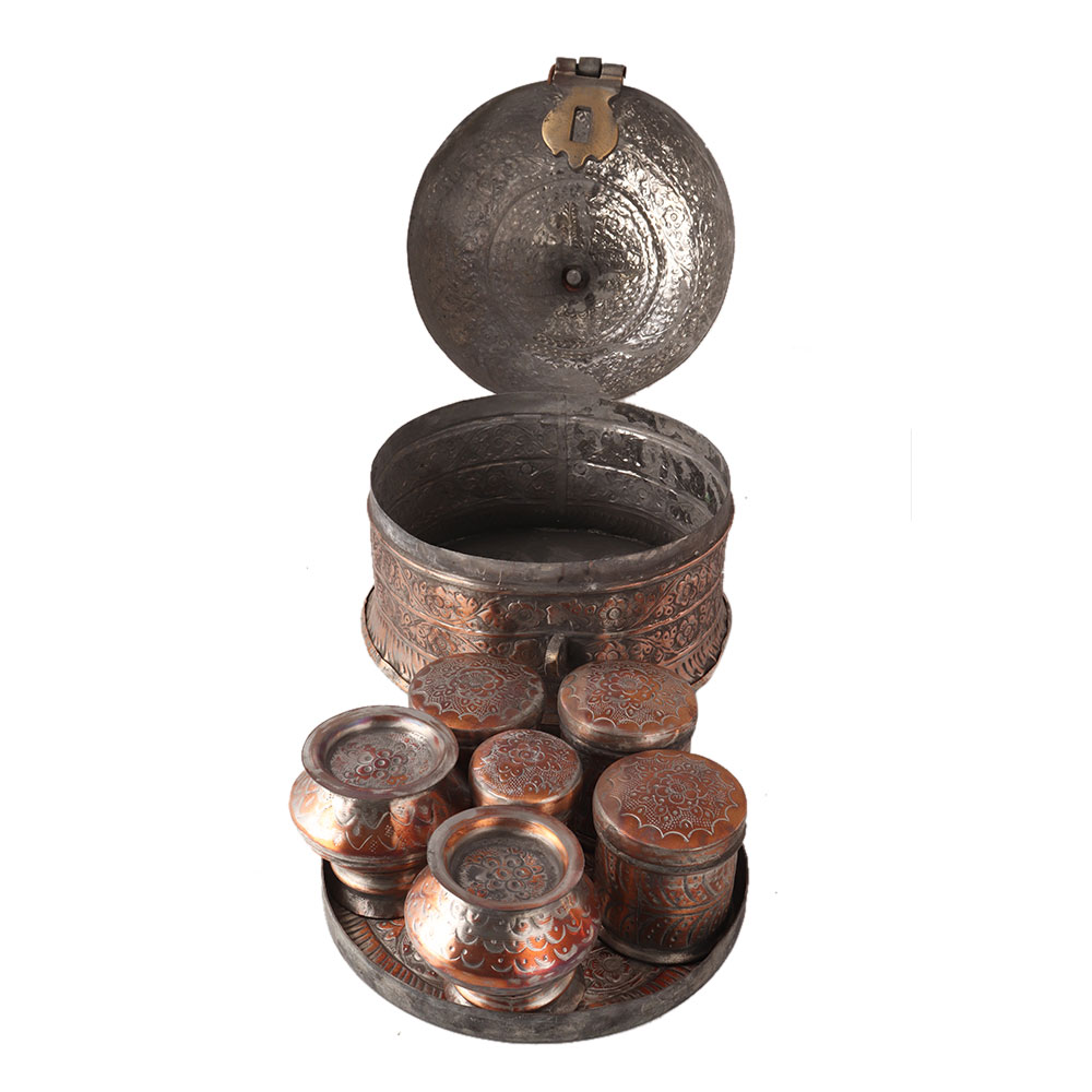 The vintage copper paan daan has 5 storage boxes. It was used to store paan or its ingredients. Engraved with beautiful floral patterns. Paan is made from betel leaves and ingredients like cardamom, cloves, zarda, supari and others. Use it to decorate your home or office.