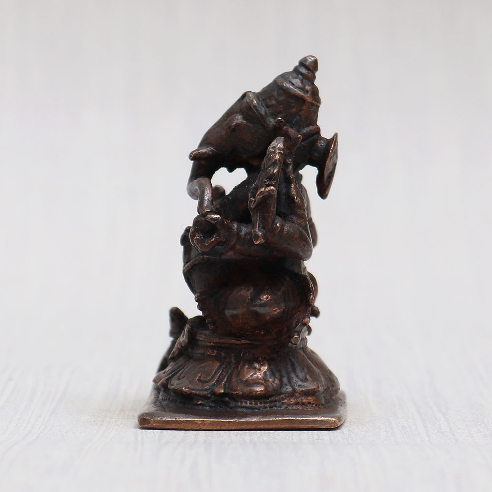 Buy a Copper Ganesh Ji idol online that is lovingly handmade by skilled Indian artisans using premium-quality copper. This divine creation showcases Lord Ganesha, the beloved elephant-headed deity, accompanied by his faithful vehicle, the mushak (the mouse), seated gracefully in front of him. The statue exudes a vintage-style finish, adding a touch of elegance to any space. Ideal for your prayer room at home, office, restaurant, cafe, or shop, this Ganesh Ji idol boasts captivating detailing that makes it perfect for exhibition, decoration, and collection. Moreover, this Ganpati statue for the car also makes for an excellent gift for near and dear ones on special, festive, or auspicious occasions, carrying blessings of prosperity and success.