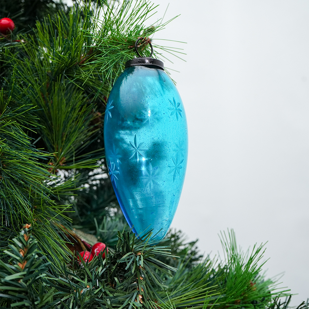 Vintage Decorative Turquoise Glass Hanging Ornament. Crafted from high-quality glass with a smooth glossy finish, this decorative bauble adds a classic and festive touch to Christmas trees, wreaths, and holiday displays.