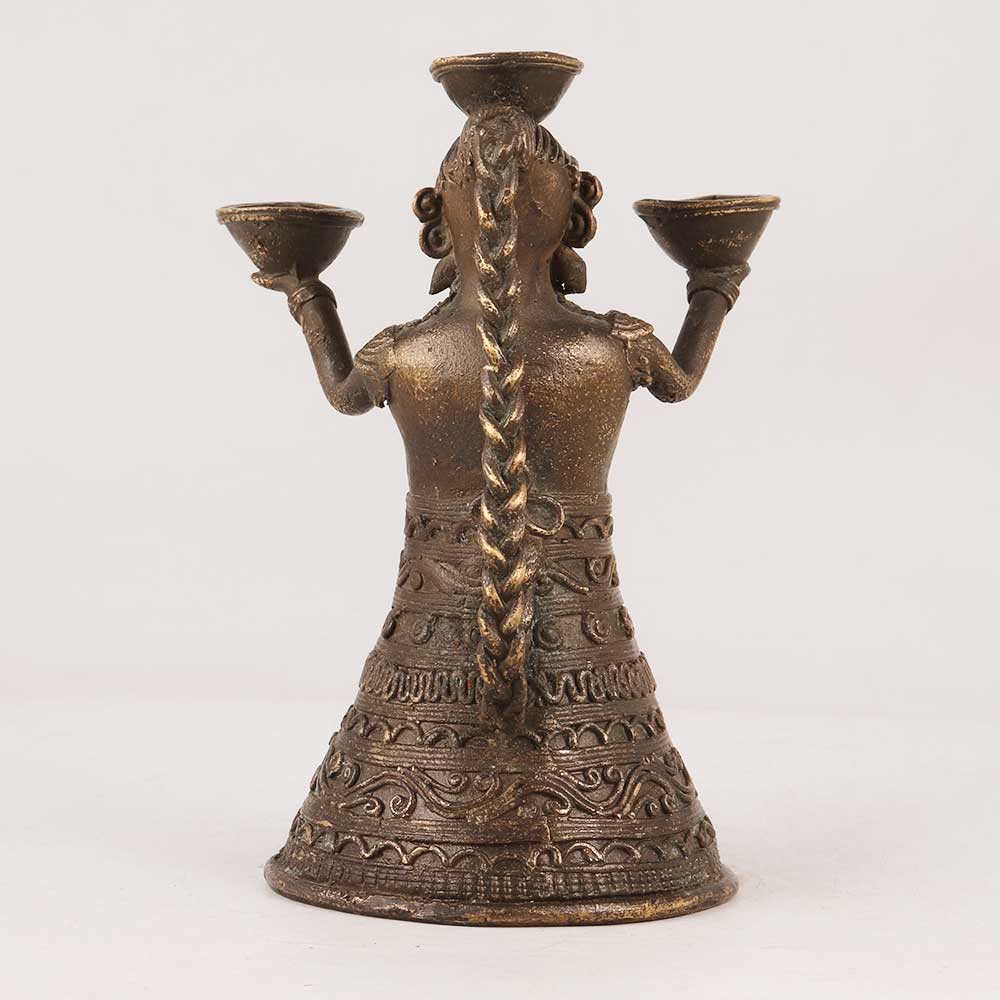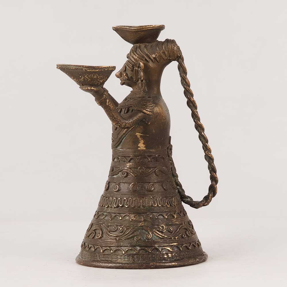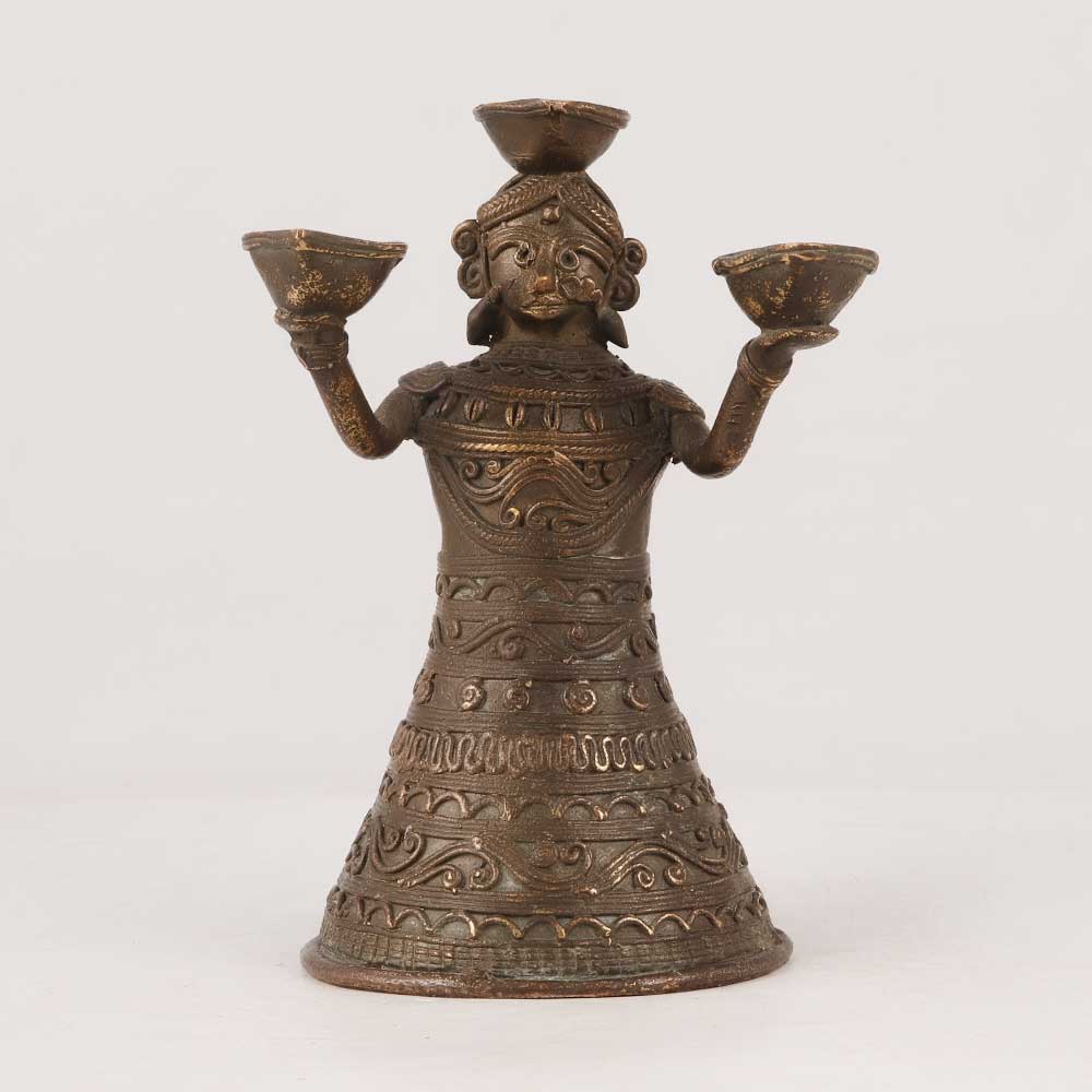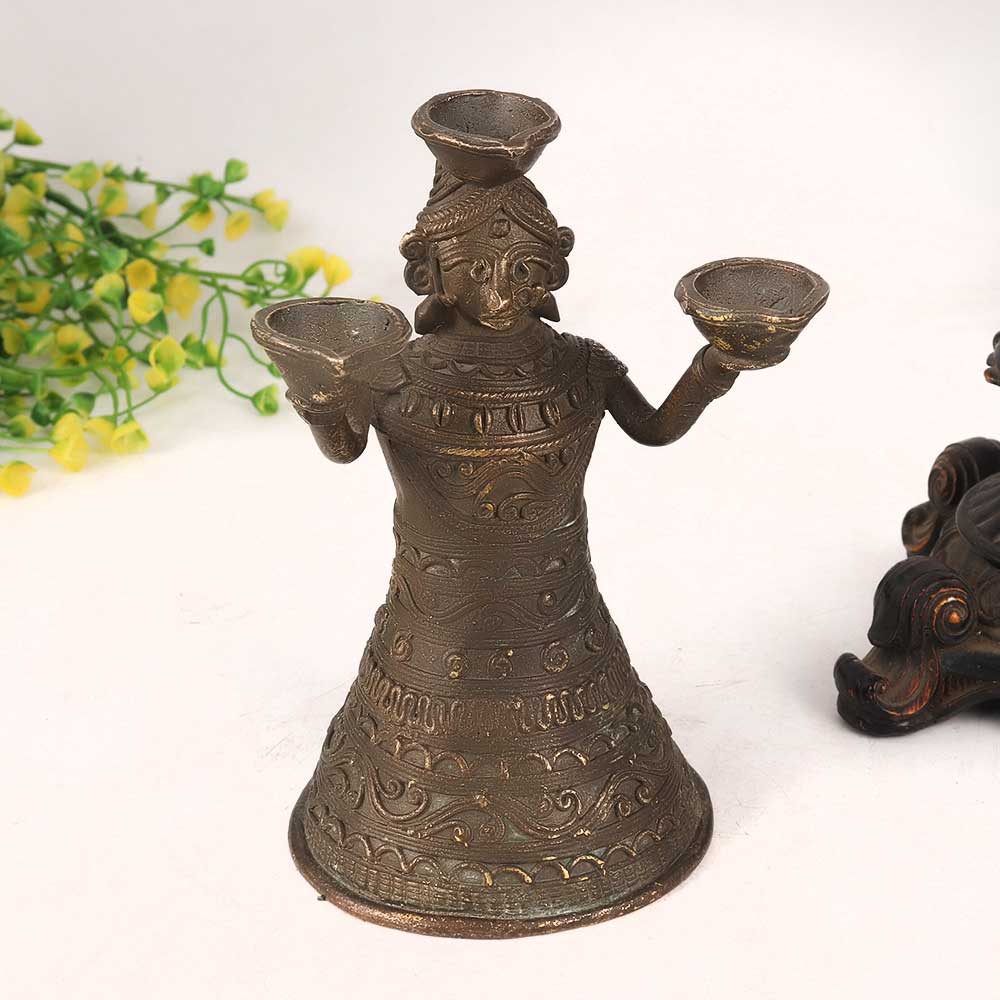 Embrace the charm of tradition and tribal art with this Vintage Brass Doll Oil Lamp in Antique Brown Finish. Handcrafted with precision by highly talented Indian craftsmen, this lamp exudes an aura of nostalgia and craftsmanship. Its unique design features intricate tribal patterns and an antique brown finish, adding a touch of vintage elegance to any space. Ideal for both spiritual and decorative purposes, this lamp can be gracefully placed in homes, offices, restaurants, hotels, or cafes, particularly in prayer rooms for worship ceremonies. Using mustard oil or ghee with cotton wicks, the lamp provides a warm, soothing glow, creating a serene ambiance during prayer rituals. Equipped with three lamps, it allows you to light up multiple areas simultaneously, enhancing its utility. Beyond its religious significance, it serves as a captivating addition to your antique collection or adds an artistic flair to exhibitions and events. Celebrate the joy of giving by presenting this lamp to your loved ones on special or festive occasions, expressing your affection and sharing the rich heritage of Indian craftsmanship.