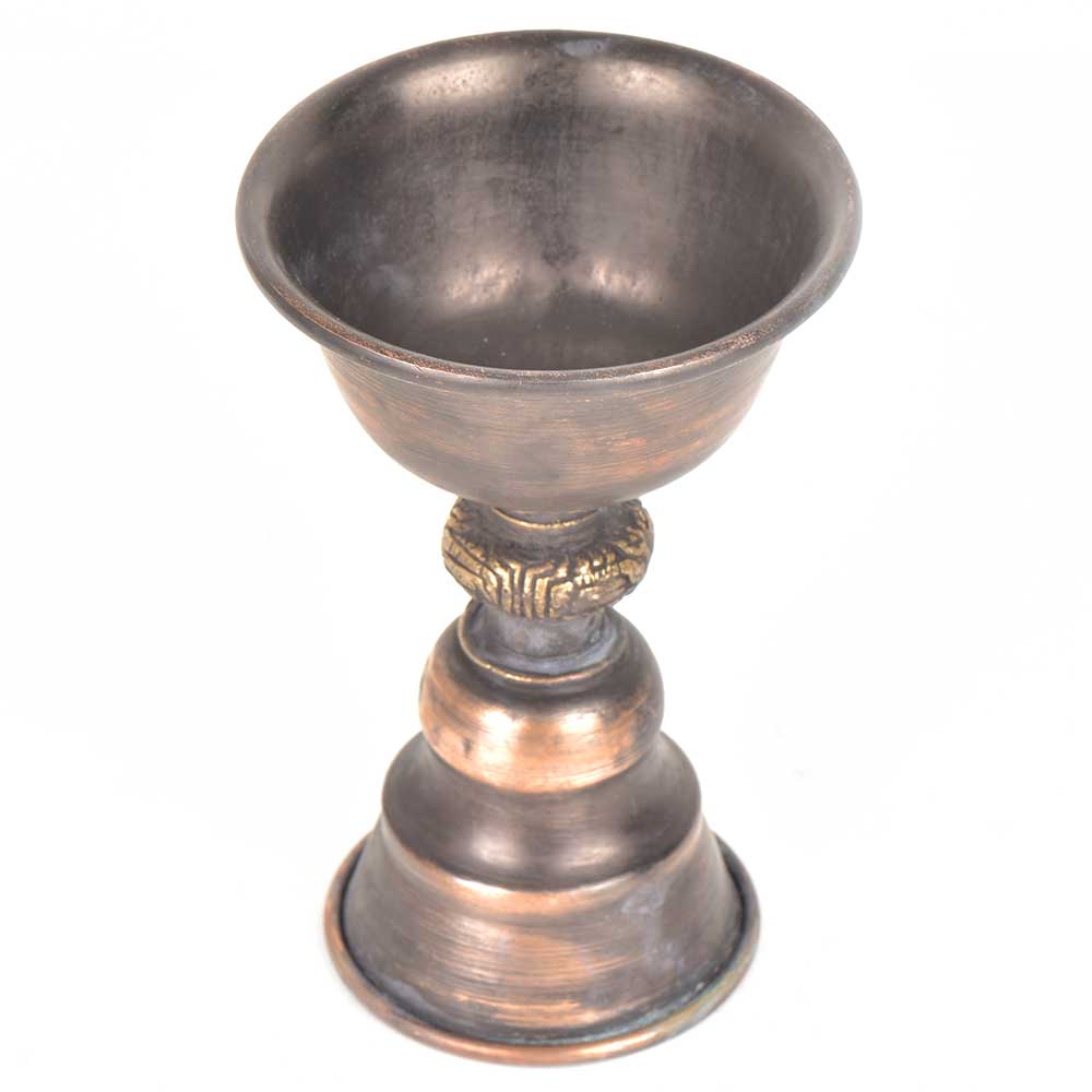 This traditional incense burner has a flared shape and is held by a thick and a decorative handle . It has an embossed design on the cup as well on the bottom of the handle The handle is long and thick as is gets heated up by burning coconut husk on which incense is sprinkled.