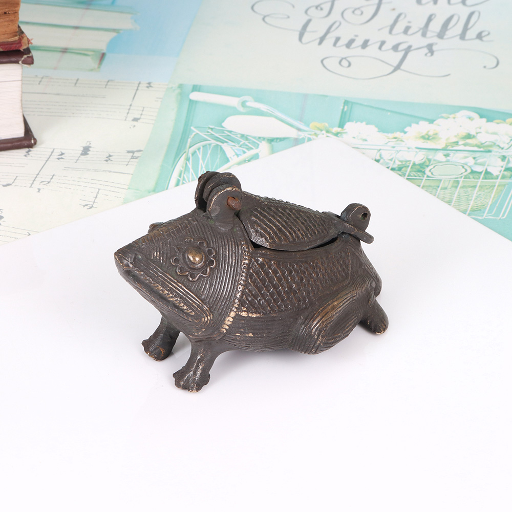 Elevate your spiritual practice and home decor with this exquisite vintage brass frog box, a captivating piece that combines traditional craftsmanship with modern elegance. Meticulously handcrafted from high-quality brass, this enchanting box features a whimsical frog design that adds a touch of vintage charm to your sacred ceremonies. Designed to hold your kumkum tilak, this compact box ensures your puja is imbued with a sense of timeless sophistication. Its durable construction and thoughtful design make it a practical and visually stunning addition to your prayer altar, allowing you to keep your ritual essentials organized and close at hand. Beyond its functional purpose, this vintage brass frog box is a true work of art that will captivate and delight. Its intricate detailing and warm, golden hue create a timeless, sophisticated ambiance, making it a cherished decorative accent in your home. Whether you use it to hold your tilak or simply admire its beauty, this enchanting box will bring a touch of vintage magic to your daily life.