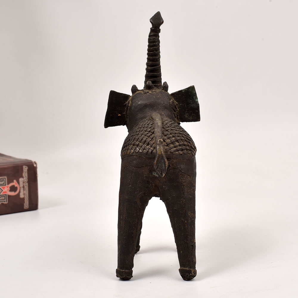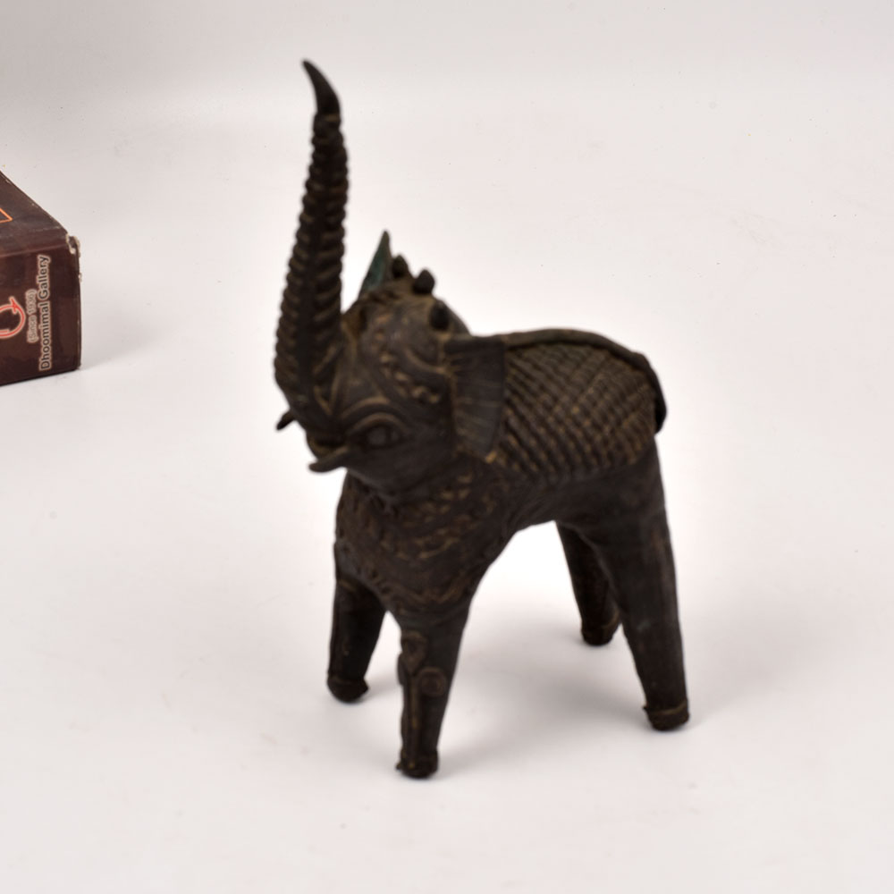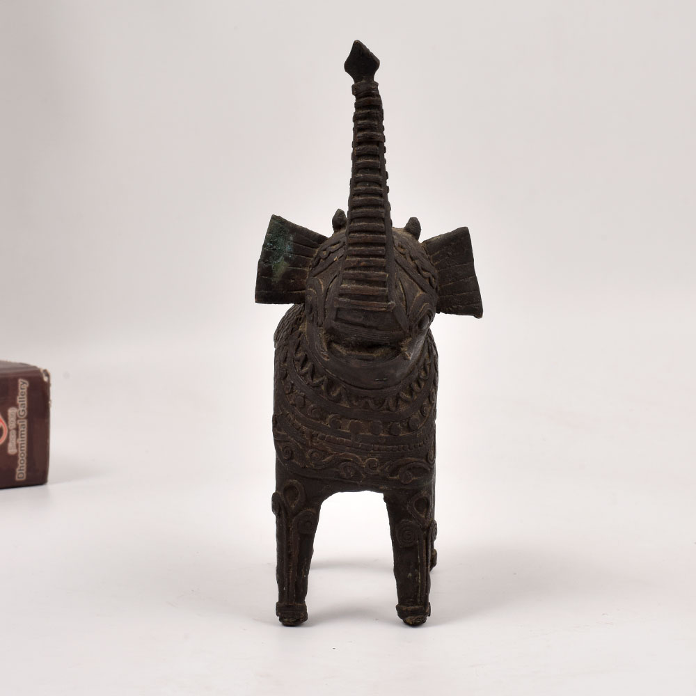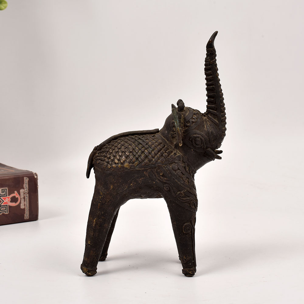 Elevate your home decor with the majestic presence of this vintage brass elephant statue, expertly crafted in the iconic Bastar Art tradition. This exquisite piece is a true testament to the unparalleled skill and artistry of Indian artisans, who have perfected their craft over generations. Meticulously sculpted from solid brass, the statue features a beautiful antique finish that gives it an air of timeless sophistication. The elephant's raised trunk is a revered symbol in many cultures, representing power, strength, and good fortune - making this piece a wonderful addition to meditation spaces, living rooms, or professional settings. At an impressive size, this brass elephant statue commands attention as a captivating focal point. Its regal presence instantly elevates the ambiance of any room, infusing it with a sense of exotic, nature-inspired beauty. Whether displayed on a mantle, side table, or office shelf, this statue is sure to become a treasured conversation piece that showcases your impeccable taste and appreciation for fine craftsmanship. Bring the grandeur of the jungle into your home or workspace with this exceptional Bastar Art masterpiece. Its exceptional quality and symbolic significance make it a truly special piece that will be admired for years to come.
