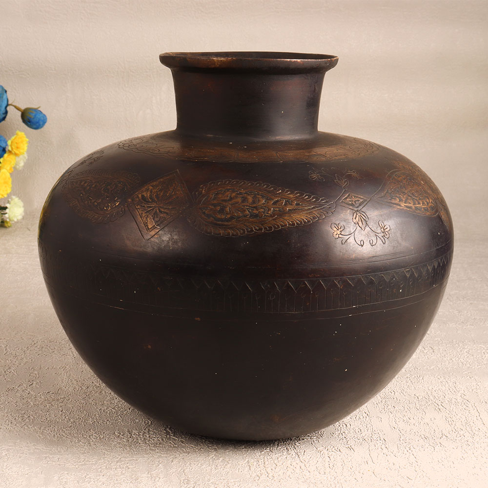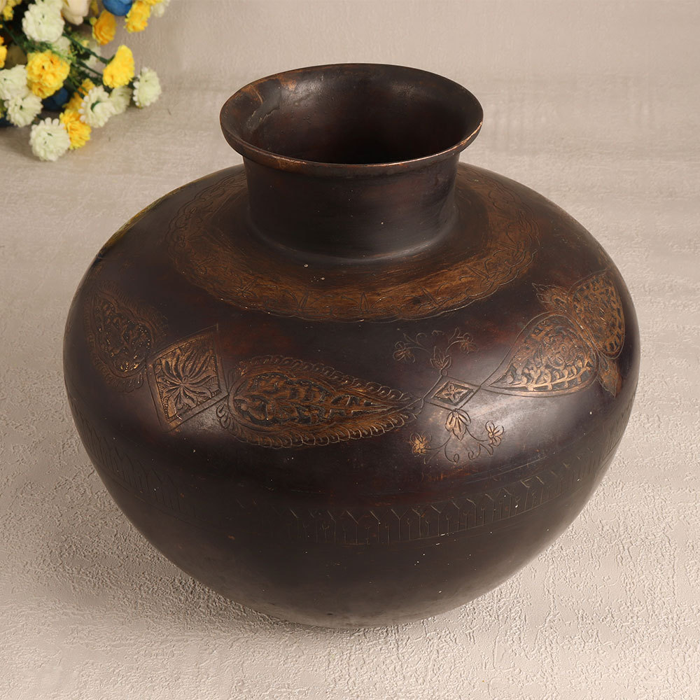 Buy a Vintage Brass Flower Pot online from our website and get a hassle free delivery at your doorstep. This piece is a testament to the craftsmanship of highly skilled Indian artisans hailing from the historic city of Hyderabad. Handmade with the utmost precision and care, this flower pot showcases their mastery in working with high-quality brass. The intricate carvings adorning the surface of the pot are a testament to the artisan's dedication to detail. The antique dark finish adds a touch of old-world charm, making it a perfect fit for a wide range of settings. Whether you're looking to enhance the ambiance of your home, office, hotel, cafe, shop, or restaurant, this flower pot will be an enchanting addition. Moreover, it's an ideal choice for collectors, as it can be proudly displayed at exhibitions and showcases. This brass flower pot also makes for a thoughtful and meaningful gift for your family, friends or relatives on special, festive, or auspicious occasions, allowing you to share the beauty and craftsmanship of Indian heritage.