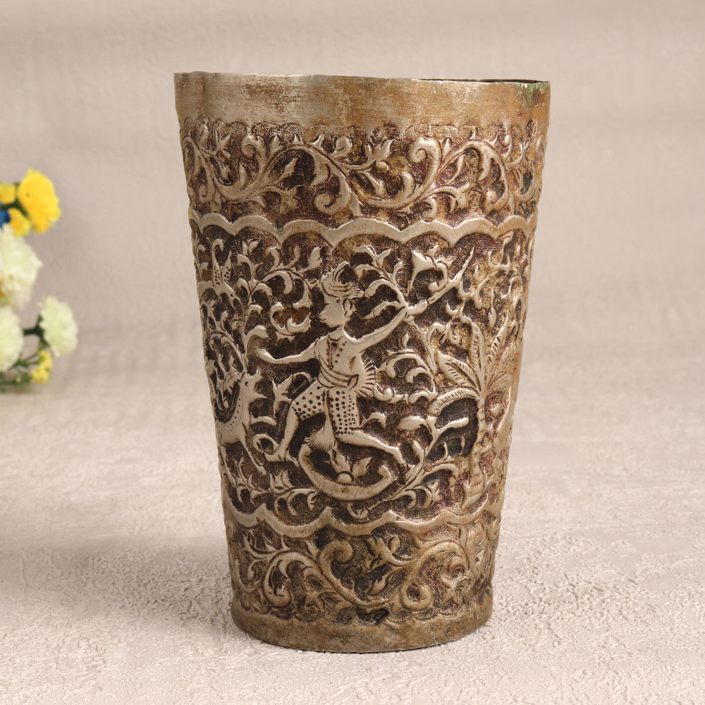 Enhance your interior decor with a timeless piece of Indian craftsmanship which is a vintage white Brass glass with exquisite carving and a captivating antique gray finish. This stunning creation is the result of highly skilled craftsmen from Himachal, who have meticulously crafted it using high-quality white Brass. This piece is not just a glass, it's a work of art that adds an air of sophistication to any space. The intricate carving on this glass reflects the rich heritage of Indian craftsmanship and tradition. Its antique gray finish gives it a sense of history and character, making it perfect for a variety of settings. Whether you want to enhance your home, office, hotel, cafe, shop, or restaurant's decor, or create a peaceful ambiance in your prayer room, this vintage white Brass glass is versatile and adaptable. Moreover, it serves as an ideal addition to your vintage collection or a remarkable piece to showcase at exhibitions. Its timeless beauty also makes it an exceptional gift for your family, friends or relatives on special, festive, or auspicious occasions.
