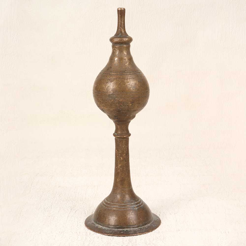 Illuminate your home with this antique-inspired brass oil lamp stand handcrafted in Central India. Its vintage design features delicate metalwork that will infuse your space with historical charm and romantic ambiance. This brass lamp stand adds a touch of the past to modern homes. Place it beside your favorite armchair or on the nightstand to provide a soothing glow during the evenings. The lamp holder is designed specifically for traditional diya oil lamps, bringing an authentic element. As an accent piece, this handcrafted lamp stand is sure to spark conversation. The delicate metalwork and weathered patina highlight the artisanal techniques used to create this exceptional piece. Let its historical elegance and warm lighting transport you back through time. Bring the mood, charm, and ambiance of days gone by into your home with this vintage brass oil lamp stand. A spectacular centerpiece that illuminates with style.
