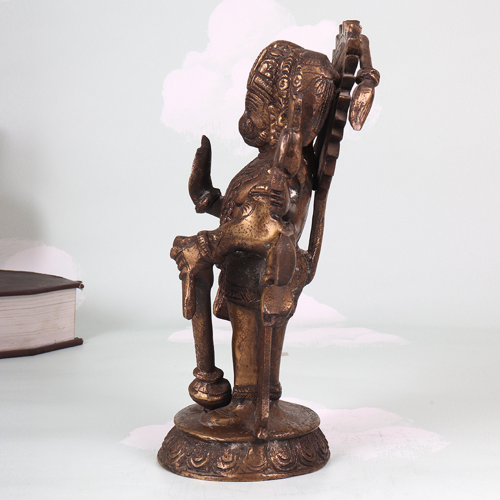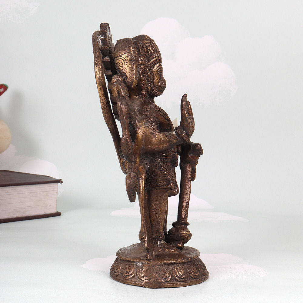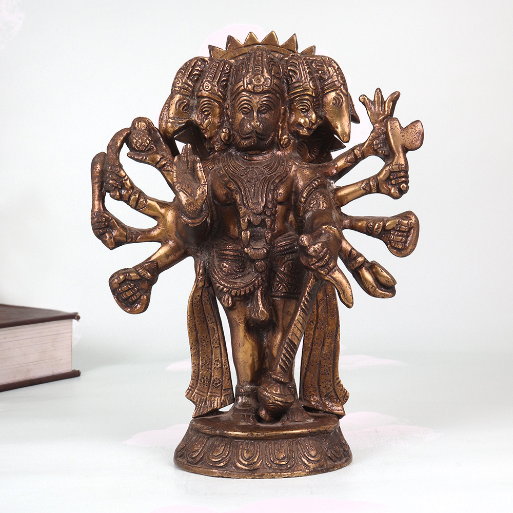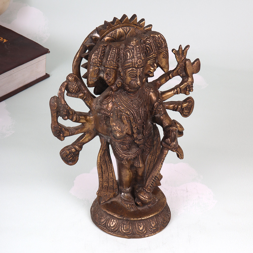 Summon the blessings and boundless protection of Lord Hanuman with this breathtaking vintage brass Panchmukhi (5-faced) statue. Crafted with meticulous detail, this heirloom-quality piece radiates the divine energy of the mighty Monkey God. As the embodiment of unwavering devotion, limitless strength, and selfless service, Lord Hanuman is a revered protector in the Hindu pantheon. Inviting his sacred image into your home or workspace ushers in his blessings of courage, resilience, and the ability to overcome any obstacle. As you gaze upon this magnificent statue, feel your worries melt away and your spirit lifted by the palpable divinity of the Monkey God. This Panchmukhi Hanuman is an invaluable tool for devotees seeking a visual aid for meditation and puja. It also makes a thoughtful housewarming or wedding gift, imbuing any space with the divine benediction of this revered Hindu deity. Elevate your home decor and your spiritual practice with this museum-worthy brass masterpiece that will be cherished for generations.