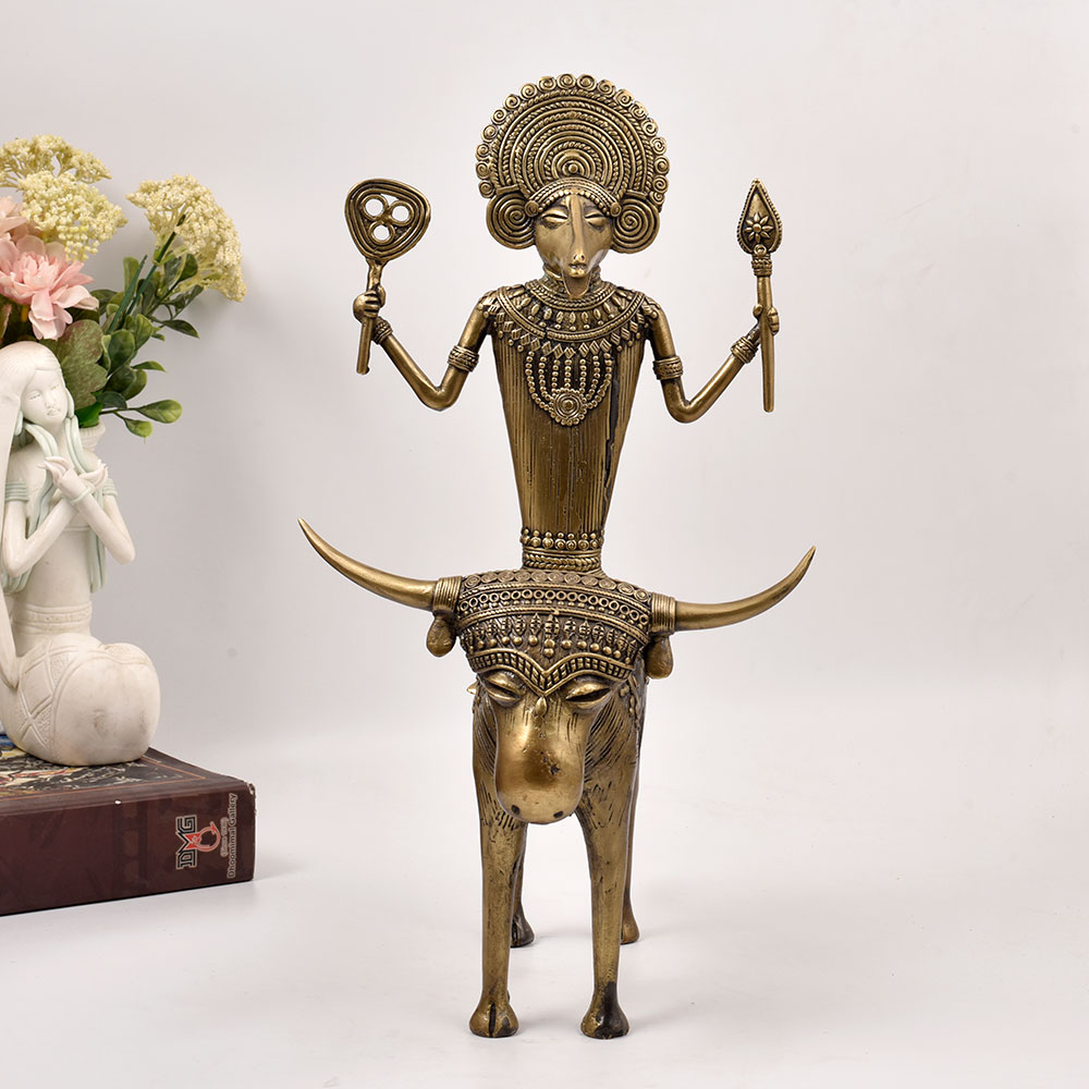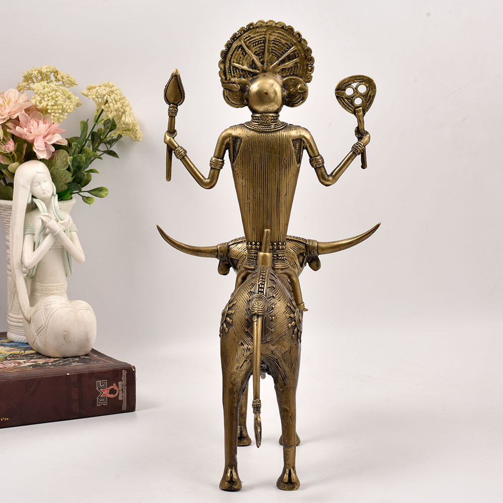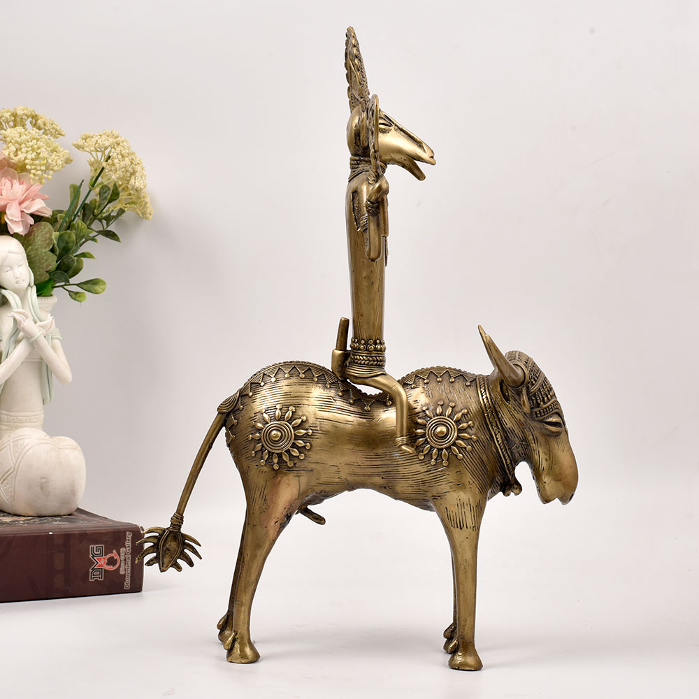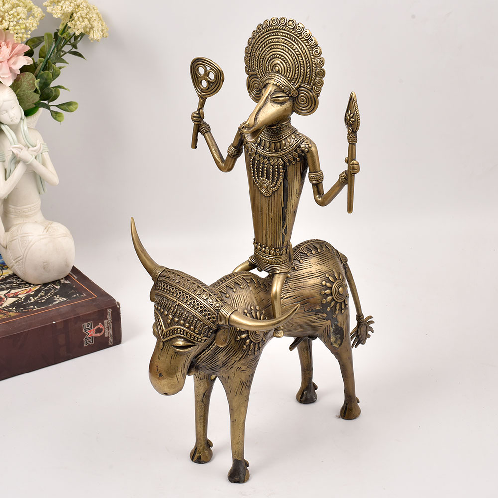 Bring the mystic power of ancient Indian deities into your home with this magnificent brass statue of a God figure riding atop an Ox. This striking brass statue is a testament to the enduring artistic legacy of India's tribal heritage. The imposing deity, seated confidently atop an Ox, exudes an aura of divine authority and spiritual wisdom. Every meticulously crafted detail, from the ornamental headpiece to the flowing robes, has been skillfully rendered by the artisans of Odisha. Whether displayed in your living room, meditation space, or office, this brass statue will command attention and inspire a sense of reverence. It's the perfect addition for those drawn to the rich cultural and mystical traditions of India. Elevate your décor while honoring the timeless artistic legacy of Odisha's tribal communities.