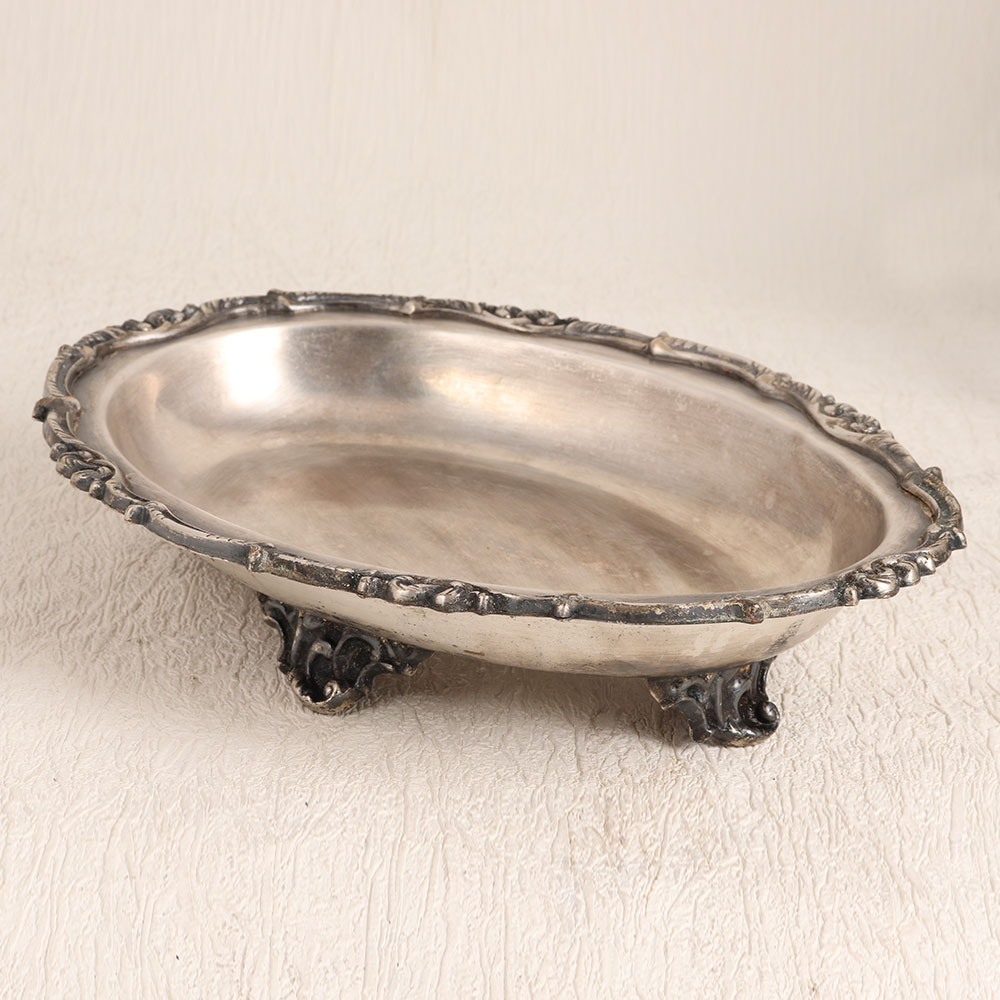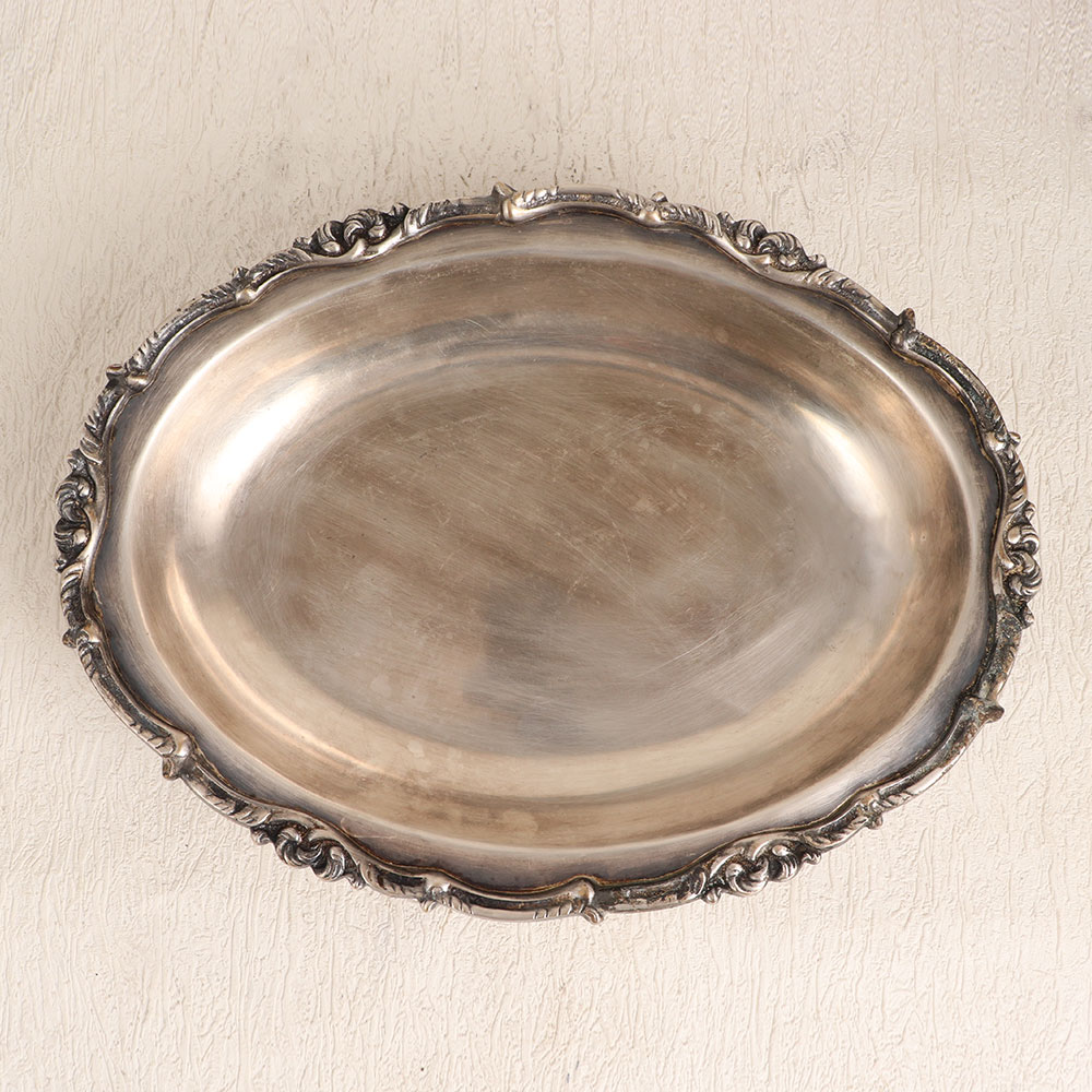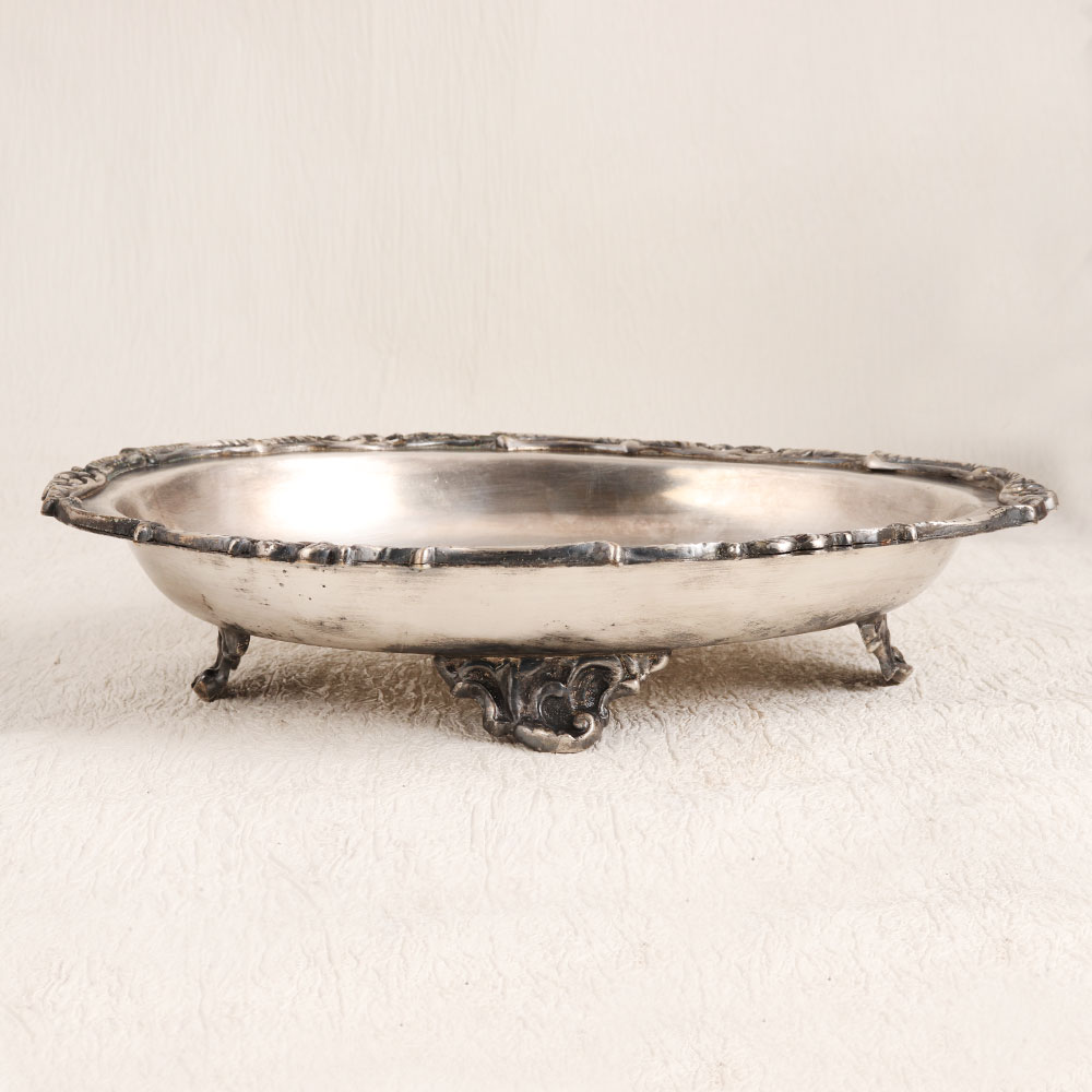 Decorate your home with a touch of timeless elegance using this exquisite vintage white metal food tray. Crafted in an oval shape, it exudes an air of sophistication with its beautiful patterns adorning the edges, all enhanced by an antique silver finish. Each tray is lovingly handcrafted by skilled artisans, following the centuries-old tradition of English Art. Made from high-quality white metal, this piece exudes a lustrous charm that's bound to capture attention. Its versatility is truly remarkable, as it can effortlessly grace the settings of your home, office, hotel, cafe, shop, or restaurant, adding a touch of refined luxury to any environment. Perfect for collectors of vintage treasures, this tray serves as an elegant addition to your antique collection. Furthermore, it makes for a thoughtful gift for your family, friends or relatives on special, festive, or auspicious occasions, symbolizing your appreciation for their refined taste and discerning eye for classic beauty.