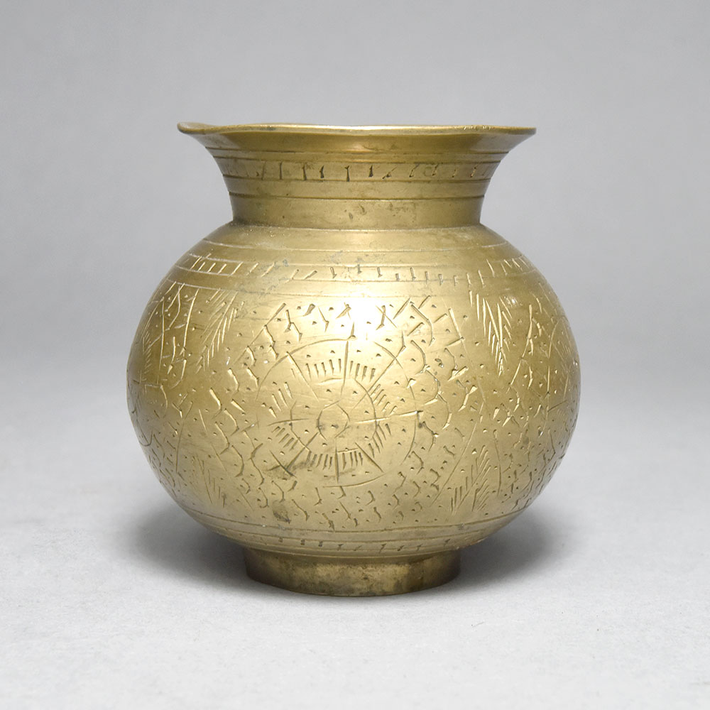 Unlock the timeless traditions of Himachal with this stunning brass holy water pot, meticulously crafted to elevate your spiritual rituals. Featuring intricate engraved floral designs, this vintage masterpiece exudes an aura of reverence and sophistication. Infuse your daily life with the transformative power of ritual. This brass holy water pot invites you to mindfully connect with the divine, whether you're performing puja, cleansing your aura, or simply seeking a moment of peaceful reflection. Its stunning appearance will captivate guests and inspire deeper spiritual engagement in your home. Designed to be a treasured heirloom, this Himachal-sourced pot is a testament to the region's rich cultural heritage. Passed down through generations, it represents a link to ancient wisdom and the beauty of traditional craftsmanship. Elevate your sacred practice and infuse your space with timeless elegance by welcoming this exquisite piece into your life.