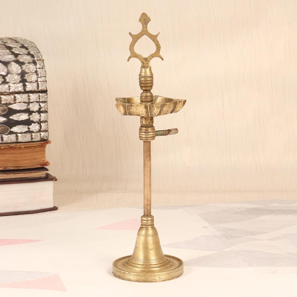 Illuminate your space with the captivating glow of a timeless treasure - the Vintage Brass Oil Lamp. This stunning piece of South India Art effortlessly blends old-world charm with modern functionality, elevating any room it graces. Imagine the warm, flickering ambiance this lamp will create, transforming your space into a cozy oasis. The adjustable height allows you to set the perfect lighting level, whether you're reading a book, enjoying a relaxing evening, or hosting guests. Powered by the timeless, natural fuels of mustard oil or ghee, the Vintage Brass Oil Lamp burns cleanly, filling the air with a soothing, comforting fragrance. This lamp is a true work of art, crafted with the utmost care and attention to detail. The brass construction ensures durability and a lustrous shine that will last for years to come. The intricate South India Art detailing on the lamp's surface adds a touch of elegance and cultural charm to your home decor. Whether you're looking to add a sense of timeless ambiance to your living room, or searching for a unique, thoughtful gift, the Vintage Brass Oil Lamp is the perfect choice.