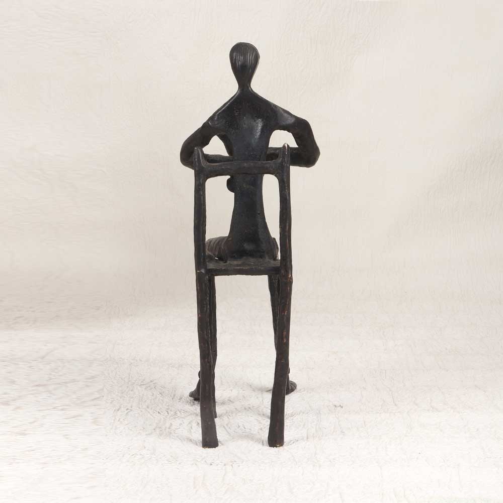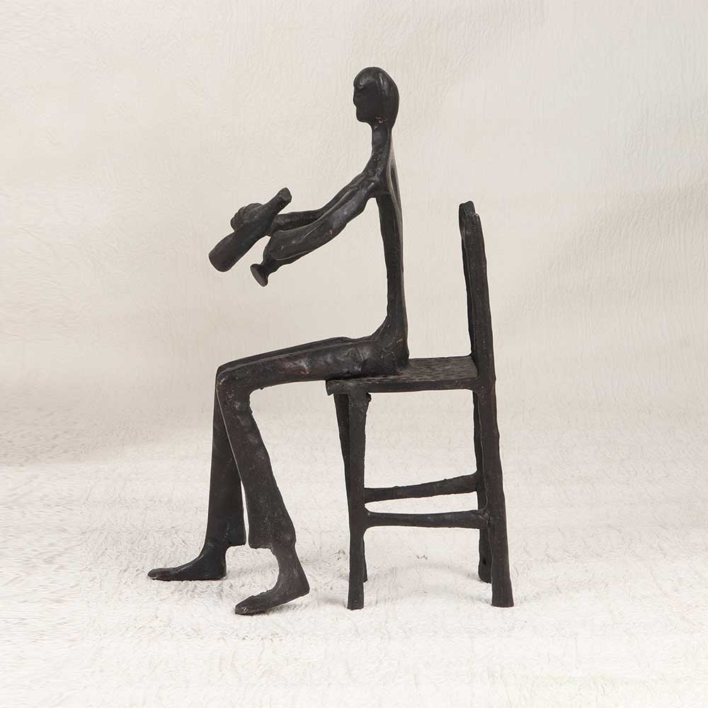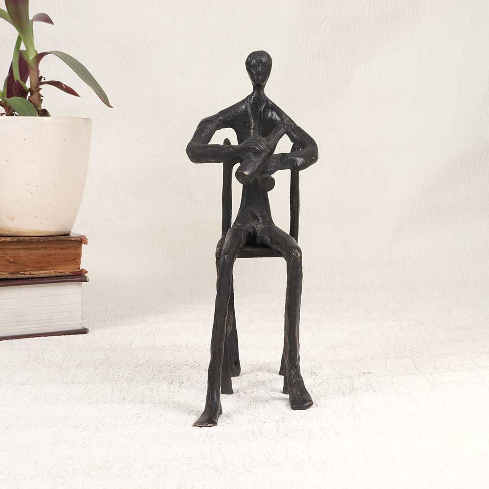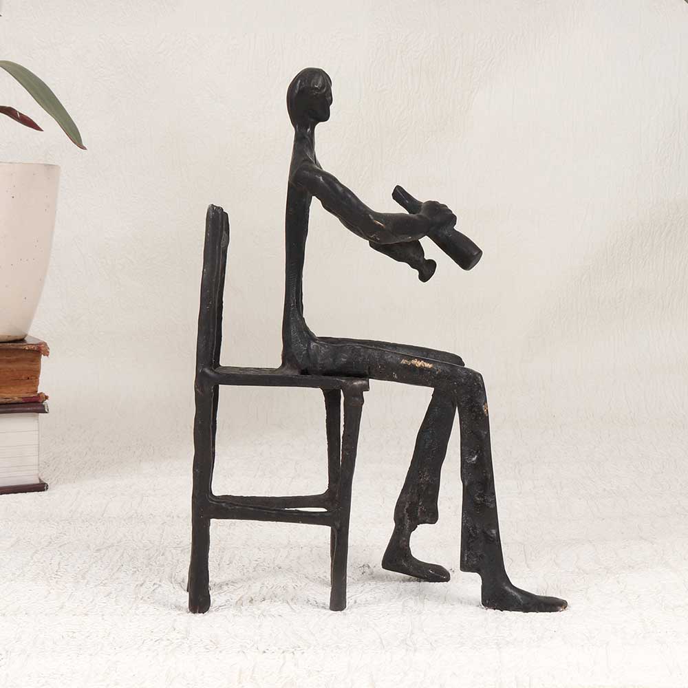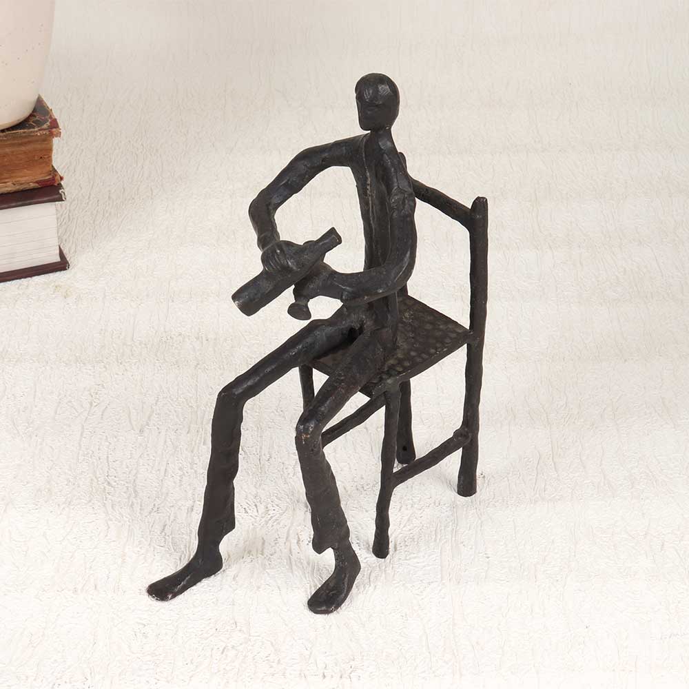 This vintage brass statue brings a musician's talent to life with finely crafted detail and aged elegance. Depicting a robed musician sitting relaxed on a wooden chair while skillfully playing music with glass bottles, this statue's exquisite artistry is a feast for the eyes. With its intricate folds of cloth, focused expression, and flowing musicality, this statue seems to move and breathe. The timeworn patina of the solid brass gives it a warmth and character that feels like an antique treasure. Place this conversation-starting statue anywhere you want an impressive statement piece with vintage appeal and artistic charm. Or gift it to a music lover who will appreciate how it captures the joy and focus of making music. However, you display it, this vintage brass musician statue will fill your home with visual melody.