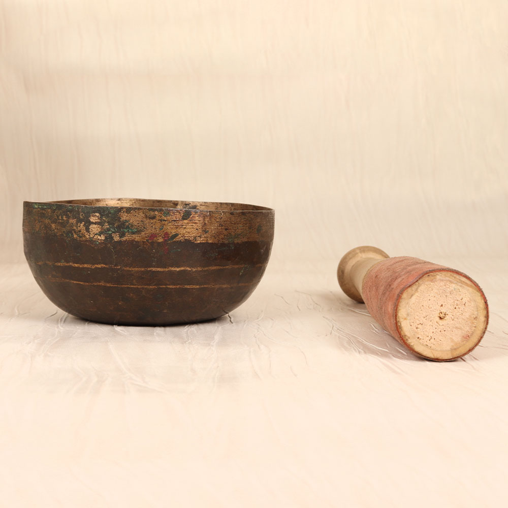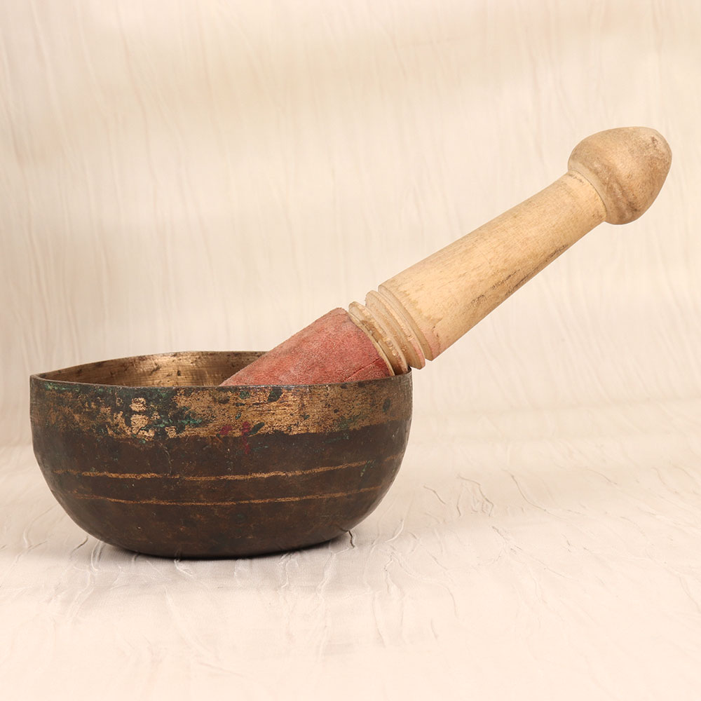 Immerse yourself in the captivating vibrations of this exquisite bell metal om singing bowl and elevate your meditation practice to new heights. Crafted with meticulous attention to detail, this vintage instrument emanates a deep, resonant tone that reverberates with the ancient Om mantra, guiding you into a state of profound relaxation and inner peace. As you gently strike the bowl with the included wooden mallet, the mesmerizing sound waves wash over you, clearing your mind of distractions and allowing you to fully connect with the present moment. Whether you're an experienced meditation practitioner or simply seeking to cultivate more mindfulness in your daily life, this om singing bowl is a powerful tool for balancing the chakras, reducing stress and anxiety, and restoring harmony to your body, mind, and spirit. Unlock the transformative power of ancient sound healing and let this exquisite instrument transport you to realms of pure tranquility, where you can deepen your spiritual practice and connect with the divine within.