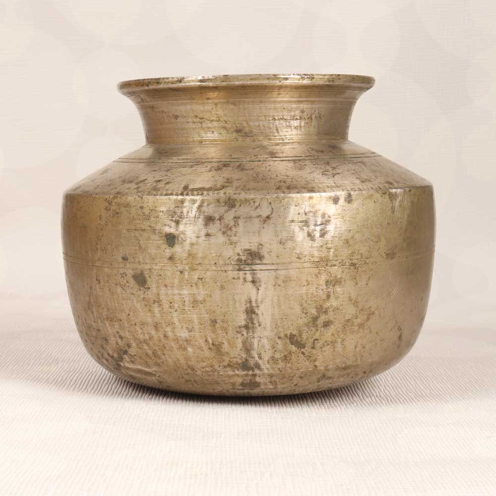 Steep yourself in spiritual tradition with this vintage brass holy water pot. Crafted in a South Indian Art style, its minimal adornments allow its graceful shape to take center stage. Use this humble vessel to hold blessed water for rituals, prayer, and peaceful contemplation. Or fill it with fresh blooms to enjoy its beauty as a vase. The aged patina and unembellished design give it an authentic, timeworn look. Display it as part of your home decor for a touch of sacred charm, or gift it to a spiritual loved one. However, you use it, this brass pot brings a whisper of ancient reverence into your daily life. Let its meditative presence sanctify your space.