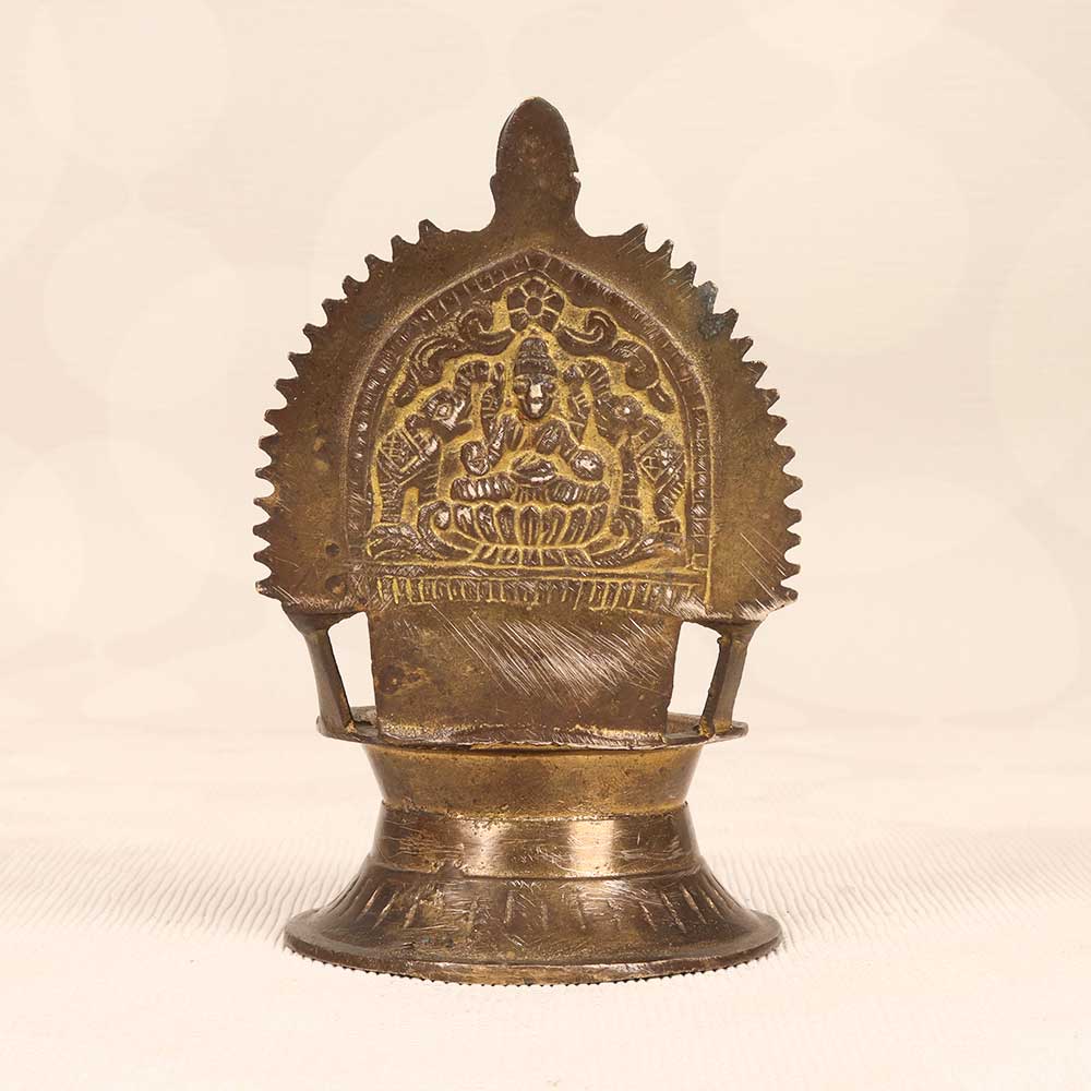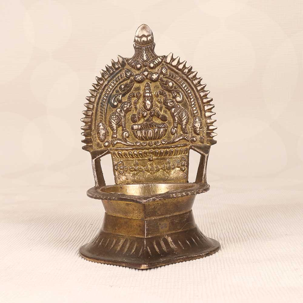 Manifest wealth and prosperity into your home with this gorgeous vintage brass Gajlaxmi Oil Lamp depicting the Goddess Lakshmi. Meticulously hand-etched by skilled artisans, this high-quality lamp features intricate floral and geometric patterns. This special lamp makes a thoughtful gift for newlyweds, a home blessing, business opening, or any special occasion. Lighting it creates a beautiful glow while attracting Lakshmi's blessings and aura of prosperity into your space. The soft warmth from the flame represents her divine radiance filling your home and life with fortune and abundance.
