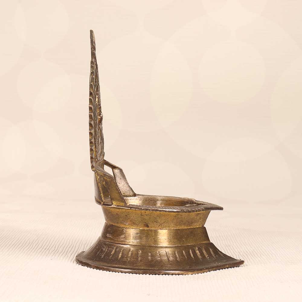 - Hand-etched brass lamp with traditional South Indian art motifs