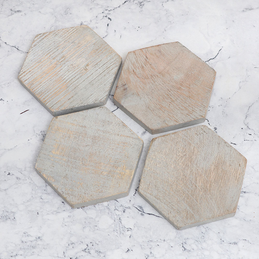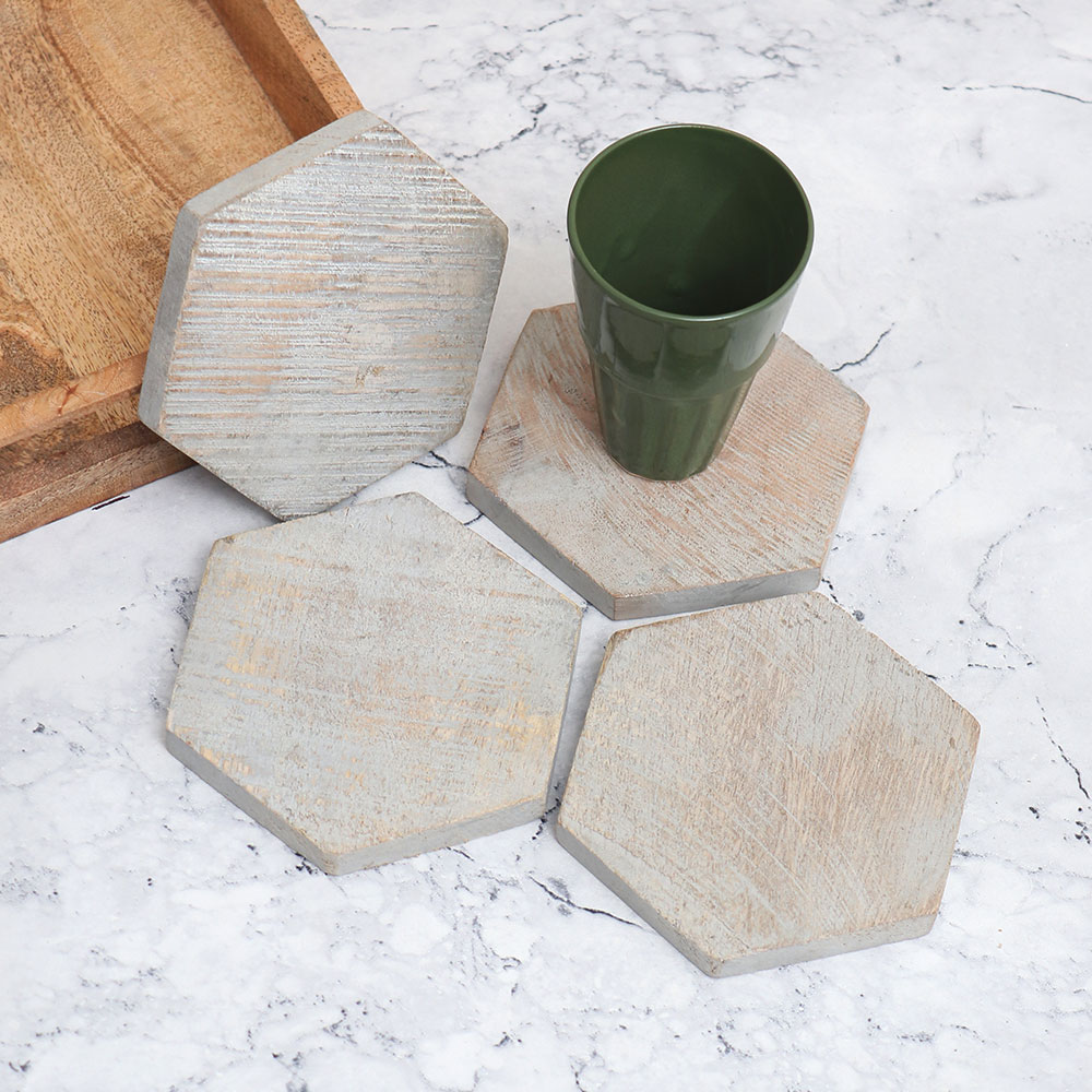 This Pack of 4 wooden coaster sets is designed to add a touch of elegance to your surroundings. These high-quality wooden tea coasters are crafted from premium wood, with each coaster shaped into a captivating hexagon form. Handcrafted by local Indian artisans, these coasters showcase the mastery of their craftsmanship. The vintage finish of these coasters imparts a classic charm, making them not only functional but also a delightful decorative piece for your home or office. Designed to hold water, tea, juice, or coffee glasses, these coasters offer protection against unsightly stains on any surface. Whether you\'re at home, in the office, a restaurant, hotel, or cafe, these coasters will elevate your beverage experience while preserving the cleanliness of your surroundings. Moreover, these wooden coaster sets make ideal gifts for your loved fours on special or festive occasions. Indulge in the best wooden coaster experience and elevate your beverage rituals with these beautifully designed wooden tea coasters.
