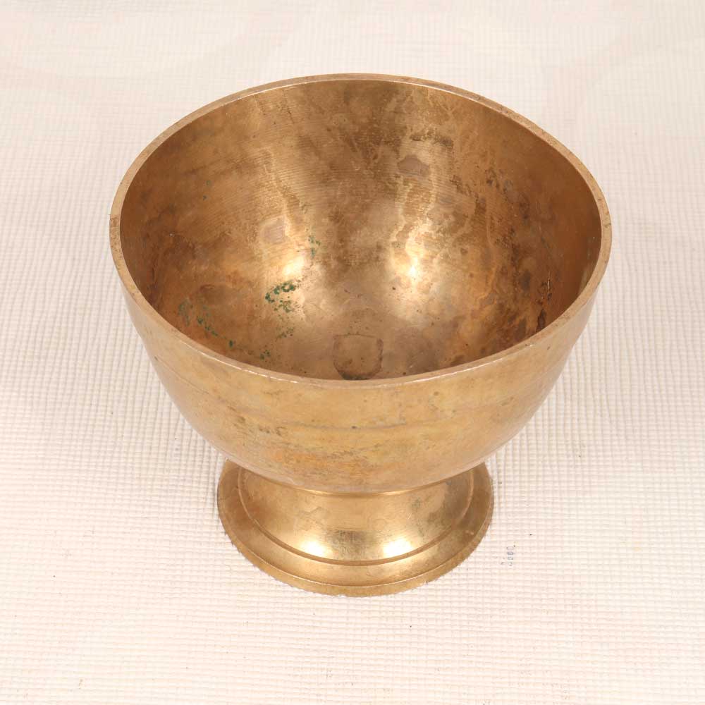 Elevate your puja rituals with this vintage brass kumkum bowl, crafted in the South Indian Art style. Featuring a round shape and plain brown finish, this bowl adds an antique touch to your sacred space. Made from durable brass, it provides the ideal vessel for holding your auspicious kumkum powder. As part of your daily spiritual practice, apply the vermilion tilaka on your forehead using this bowl's contents to promote concentration before meditation or prayer. Place the bowl near your puja altar, alongside idols, flowers and diyas to accent your worship area with heritage. Passed down for generations, this handcrafted kumkum bowl represents Indian tradition. Use it daily to store your sacred powder, adding a meaningful touch of antiquity to your rituals. With solid brass construction and timeless design, this vintage bowl will maintain its spiritual significance for years to come.