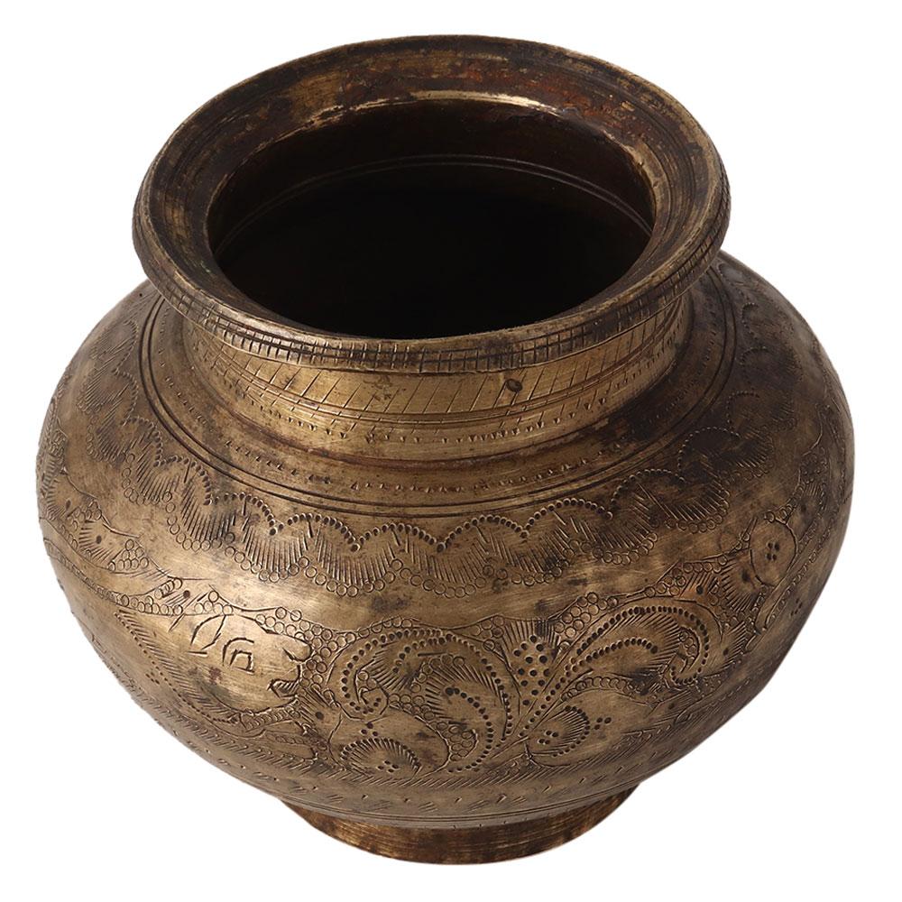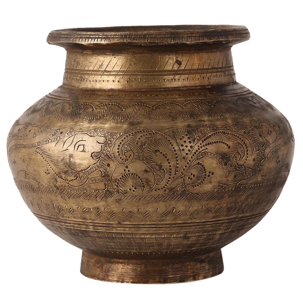 A Vintage hand carved brass pot crafted by skilled craftsman of India. It can be used in wedding ceremonies or display the item in your collection.