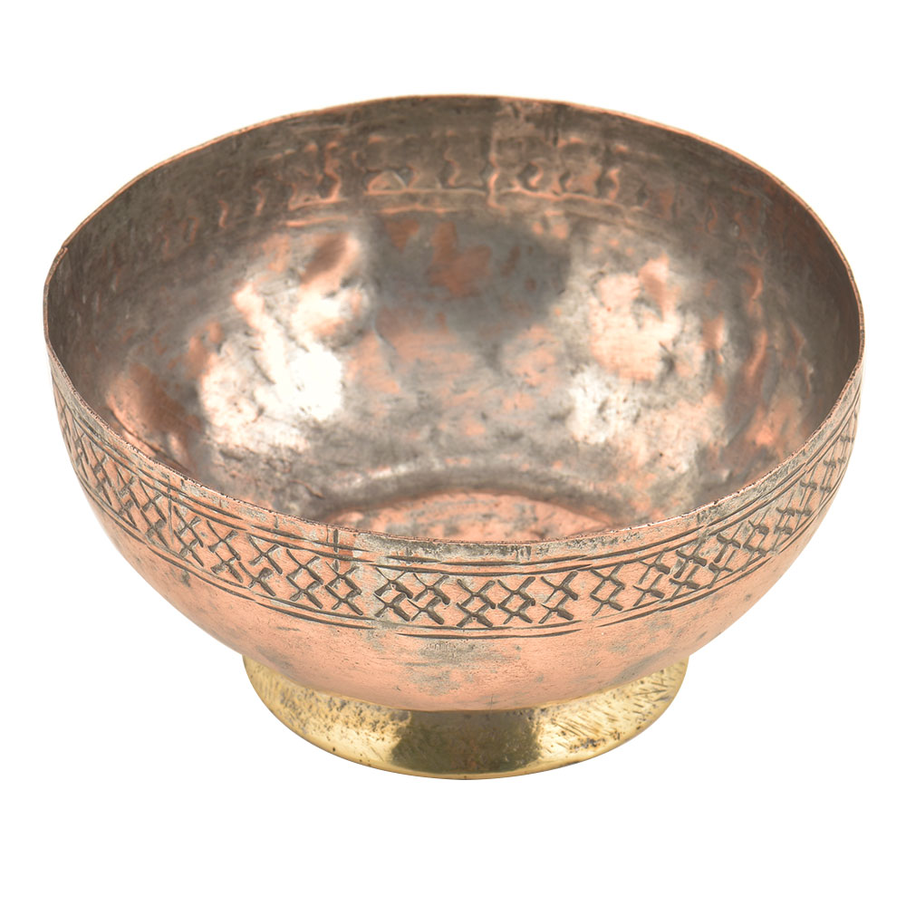 The hand made Copper Bowl is a Beautifully Unique Piece Complete with a Hammered cross Pattern Design. The Perfect Addition to Any Set or Your Home Kitchen Decor. It has geometrical patterns to the side and base and a rolled over top rim of the bowl. The perfect addition to any set or your home kitchen decor.
