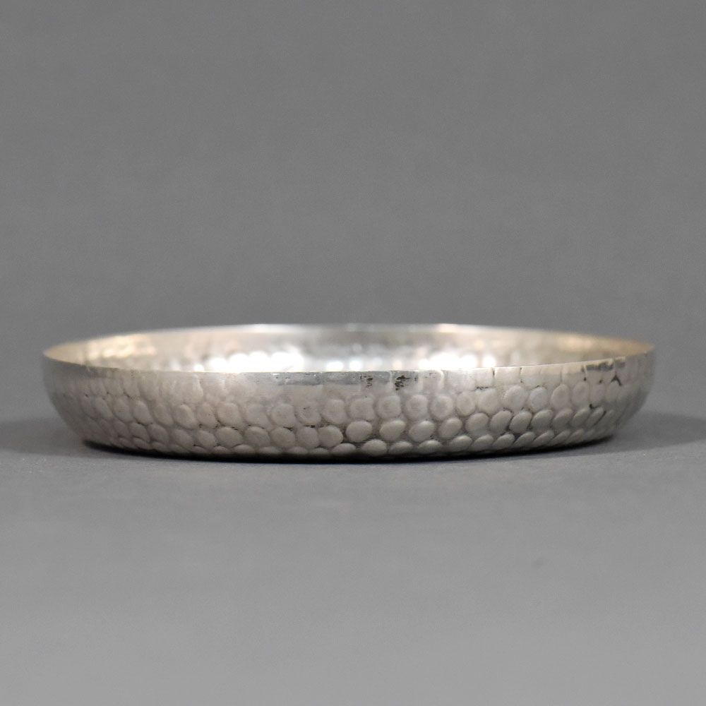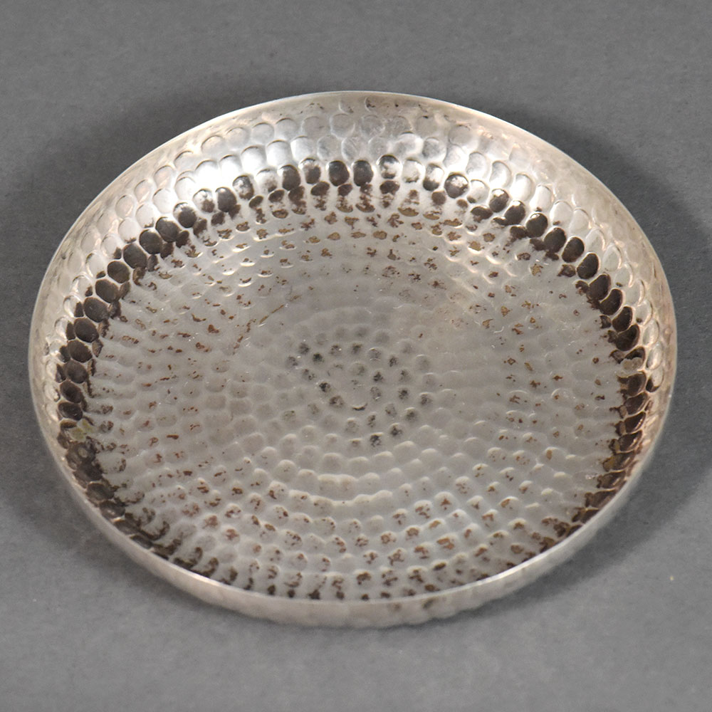 Material: Silver Mark: SILVER stamp Form: Shallow circular tray with raised rim Finish: Hand-hammered Technique: Hand-worked silver Dimensions & Weight: