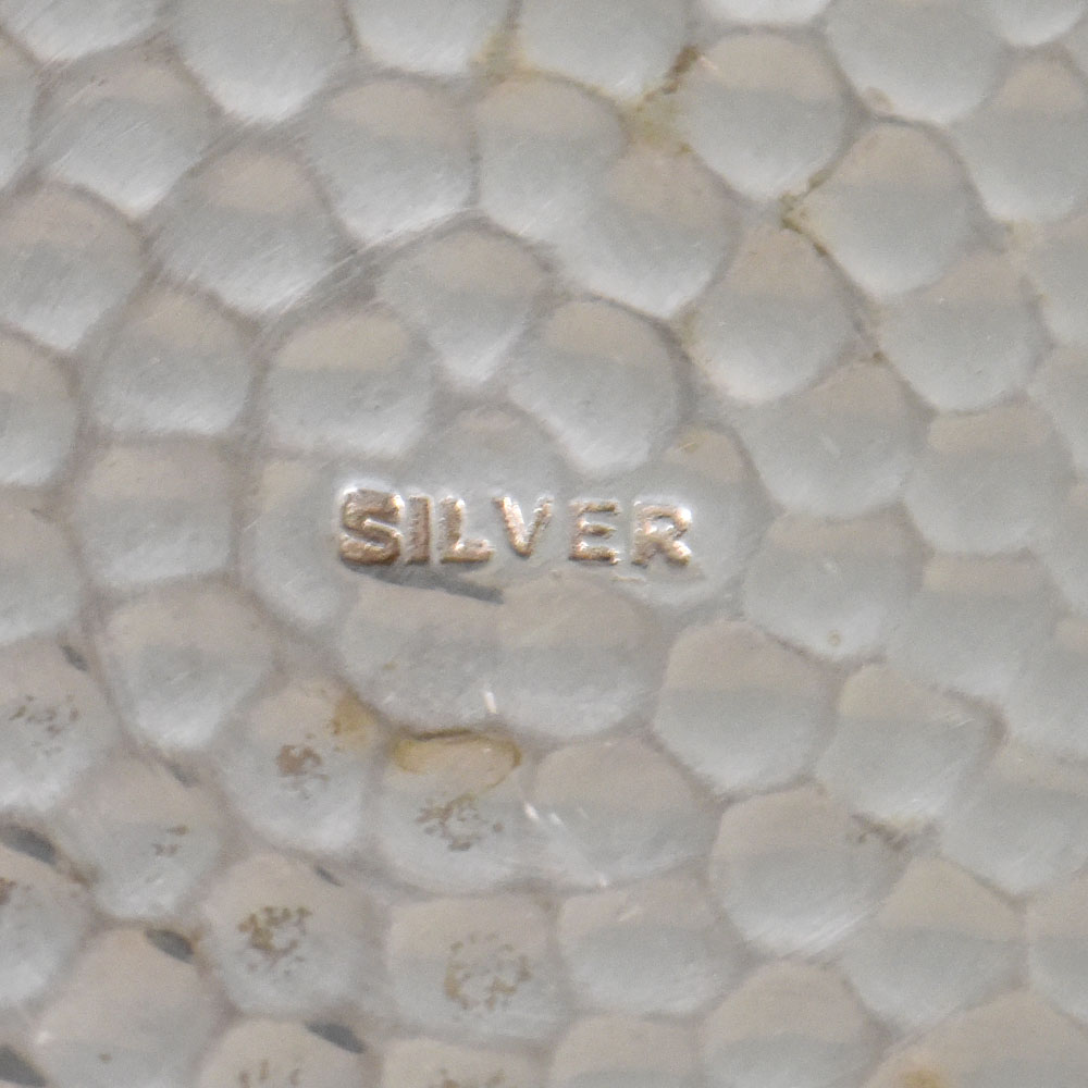 This finely crafted silver tray is distinguished by its shallow circular form and richly textured, hand-hammered surface. The tray features a gently raised rim and a low profile, giving it a refined yet understated presence suitable for both display and practical use. The surface is decorated with a dense planished (hammered) pattern, created by repeated hand strikes across the silver. This technique produces a rhythmic, organic texture that catches light softly and emphasizes the handcrafted nature of the piece. The hammer marks are visible on both the interior and exterior, with natural variation that reflects individual workmanship rather than machine production. The underside bears a clear SILVER stamp. This marking indicates that the tray is made of silver but does not specify a precise fineness such as sterling. Such marks are commonly associated with handcrafted or export silver, where purity is identified generically rather than through formal assay symbols. The absence of assay hallmarks suggests the piece was not produced under a British or European hallmarking system. The overall construction, form, and surface treatment are consistent with traditional hand-worked silver trays intended for table use, presentation, or decorative purposes. Its restrained design allows the texture of the silver itself to remain the primary visual feature.