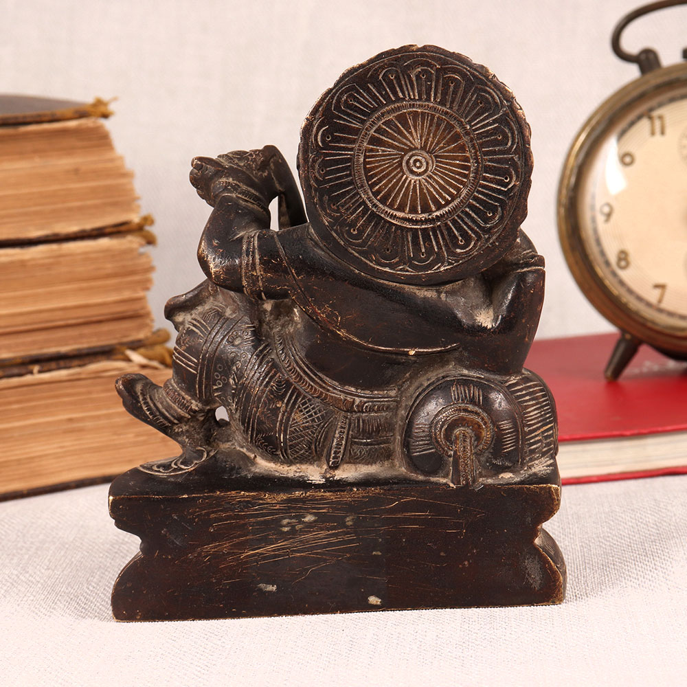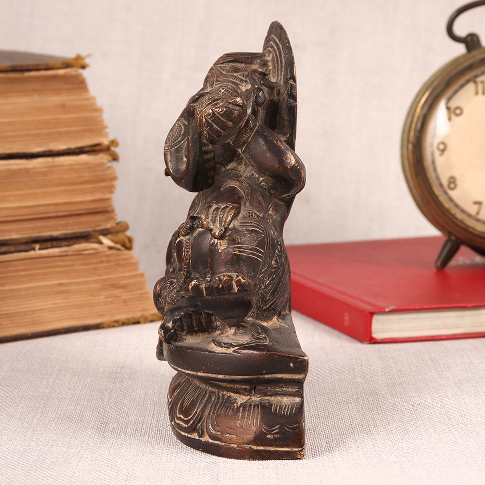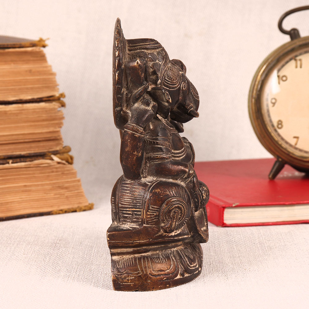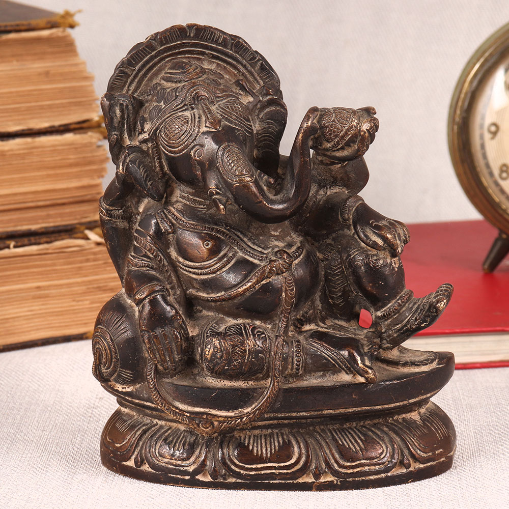 Buy a Vintage Brass Statue of Lord Ganesha online which is meticulously crafted by highly skilled and experienced Indian artisans. This masterpiece showcases Lord Ganesha seated regally on a platform, elegantly resting on a cushion in an antique brown finish. Crafted from high-quality brass, this statue radiates timeless beauty and craftsmanship. It embodies the rich cultural heritage of India, capturing the essence of spirituality and tradition. This versatile piece can enhance the ambiance of your home, office, restaurant, hotel, shop, or cafe. Place it in your prayer room as a divine symbol, or use it as a captivating decoration that adds a touch of vintage charm to any space. Perfect for vintage collectors, this statue is a conversation starter, making it an ideal addition to exhibitions. It's also a thoughtful gift for your family, friends or relatives on special, festive, or auspicious occasions, symbolizing blessings, prosperity, and the enduring spirit of Lord Ganesha.