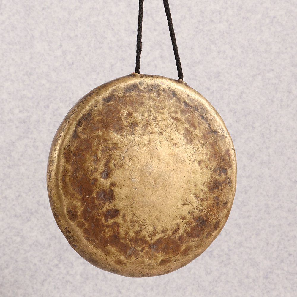 A Vintage Bell Metal Gong that is a masterpiece crafted by highly skilled artisans in the timeless Tibetan art tradition. This captivating piece boasts a rich antique brown finish that adds a touch of old-world charm to any space. Handcrafted with precision and care, the gong is forged from high-quality bell metal, ensuring durability and a resonant, melodious sound. Equipped with a delicate string for easy hanging, this gong becomes a versatile addition to your home, office, restaurant, hotel, or cafe, seamlessly blending into various settings as a striking decorative element. Its unique design and artisanal craftsmanship make it a standout piece in any collection of vintage treasures. The Vintage Bell Metal Gong serves not only as a visual delight but also holds therapeutic properties, creating soothing, calming tones when struck. Place it in your meditation space or use it during mindfulness practices to enhance the atmosphere. This timeless artefact is not just a charming décor item but also a meaningful and thoughtful gift for your family, friends or relatives on special, festive, or auspicious occasions.