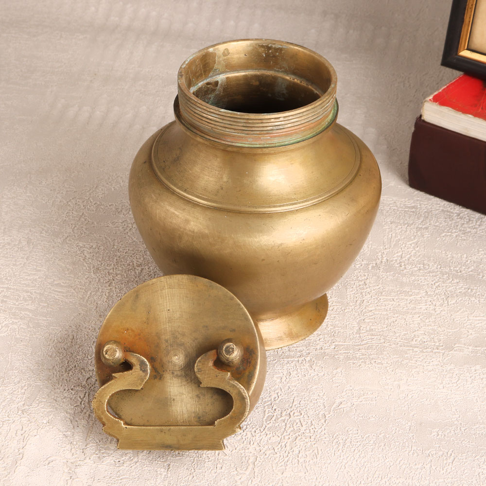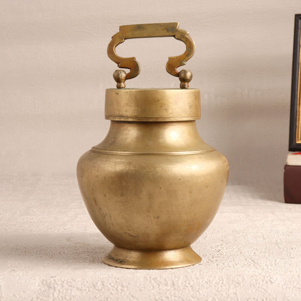 Enhance your spiritual and aesthetic ambiance with our Vintage Brass Holy Water Pot which is also known as Ganga Jali. Handcrafted by highly skilled Indian artisans, this piece is a testament to the timeless artistry and devotion that echoes through generations. The pot, with its charming lid and sturdy handle, is designed to cradle holy Ganga water during prayers or to showcase vibrant floral arrangements, adding a touch of divinity to any space. Distinguished by its antique brown finish, the pot is meticulously crafted from high-quality brass, reflecting the enduring elegance of bygone eras. Its versatile charm makes it a perfect addition to your home, office, restaurant, hotel, or cafe, serving as a captivating decor piece. Ideal for collectors of vintage treasures, this holy water pot is a precious gem that can be proudly displayed or gifted to your family, friends or relatives on special, festive, or auspicious occasions.