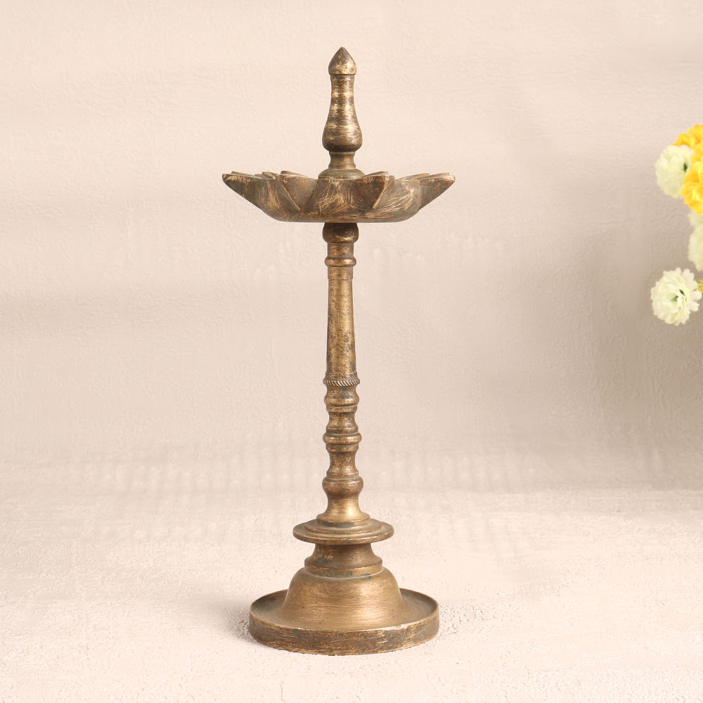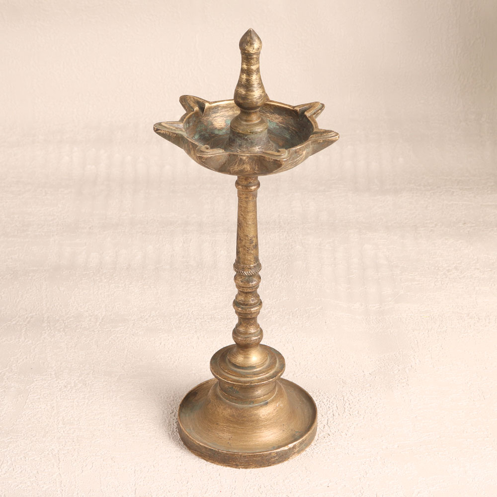 This Vintage Brass Oil Lamp is a stunning embodiment of South Indian artistry. Handmade by highly talented Indian artisans, this lamp showcases their craftsmanship and attention to detail. Its antique brown finish adds a touch of old-world charm and elegance. This lamp is not just a decorative piece, it's a functional work of art. Featuring seven jyots (lamps), it can be lit using traditional materials like mustard oil or ghee and cotton wicks. The warm, flickering glow it produces creates a soothing and inviting atmosphere, making it perfect for use at home, office, hotels, cafes, shops, restaurants, or prayer rooms. Whether placed as a centerpiece or displayed in a vintage collection or exhibition, this lamp stands out as a timeless masterpiece. It's ideal for use during prayers, auspicious occasions, or even as a thoughtful gift for your family, friends or relatives during special, festive, or celebratory moments.