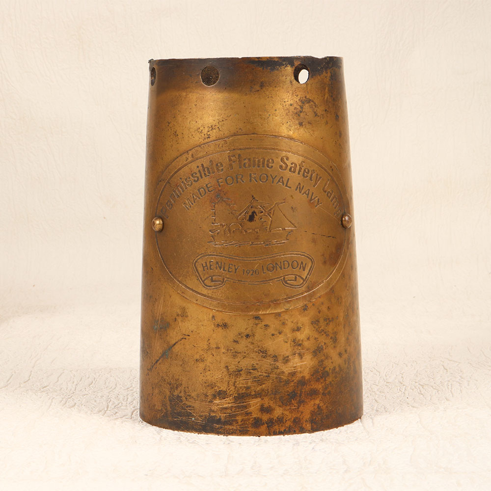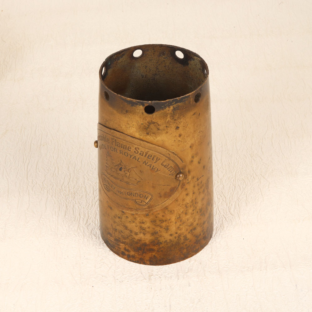 Buy a vintage brass lamp part online that seamlessly blends functionality with timeless elegance. Crafted in a distinctive pot-like shape, this artefact features remarkable engravings that tell a story of its rich heritage. The words "Permissible Flame Safety Lamp," "Made for Royal Navy," and "Henley 1920 London" evoke a sense of authenticity and historical significance, making it a unique and cherished addition to any space. Handmade by skilled artisans in the renowned English Art tradition, this brass lamp part boasts a lustrous antique brown finish that accentuates its vintage appeal. Its versatility shines through, as it can double as a distinctive flower pot, adding a touch of sophistication to your home, office, restaurant, hotel, or cafe. The meticulous craftsmanship and attention to detail make it a standout piece in any setting, while its historical connections make it a valuable addition to any vintage collection. Embrace the opportunity to share the beauty of the past by gifting this remarkable piece to your family, friends or relatives on special, festive, or auspicious occasions.
