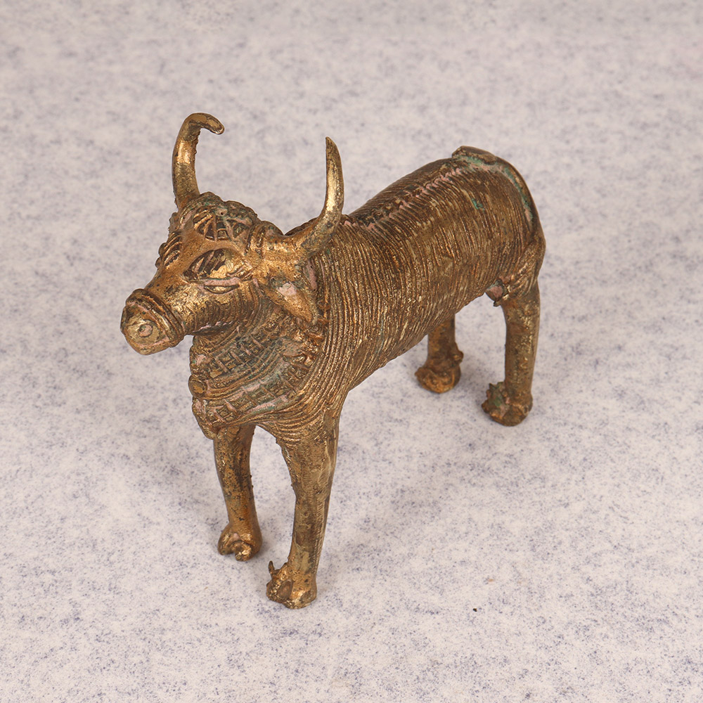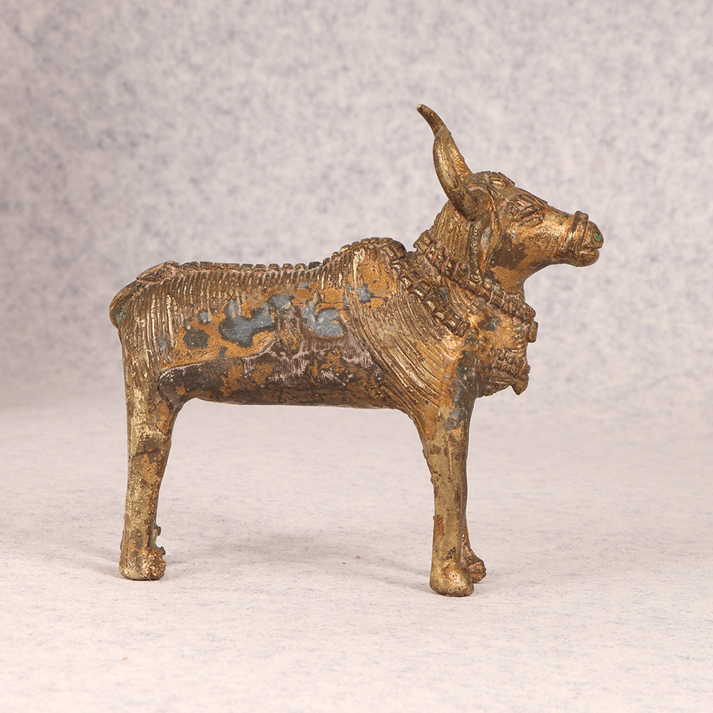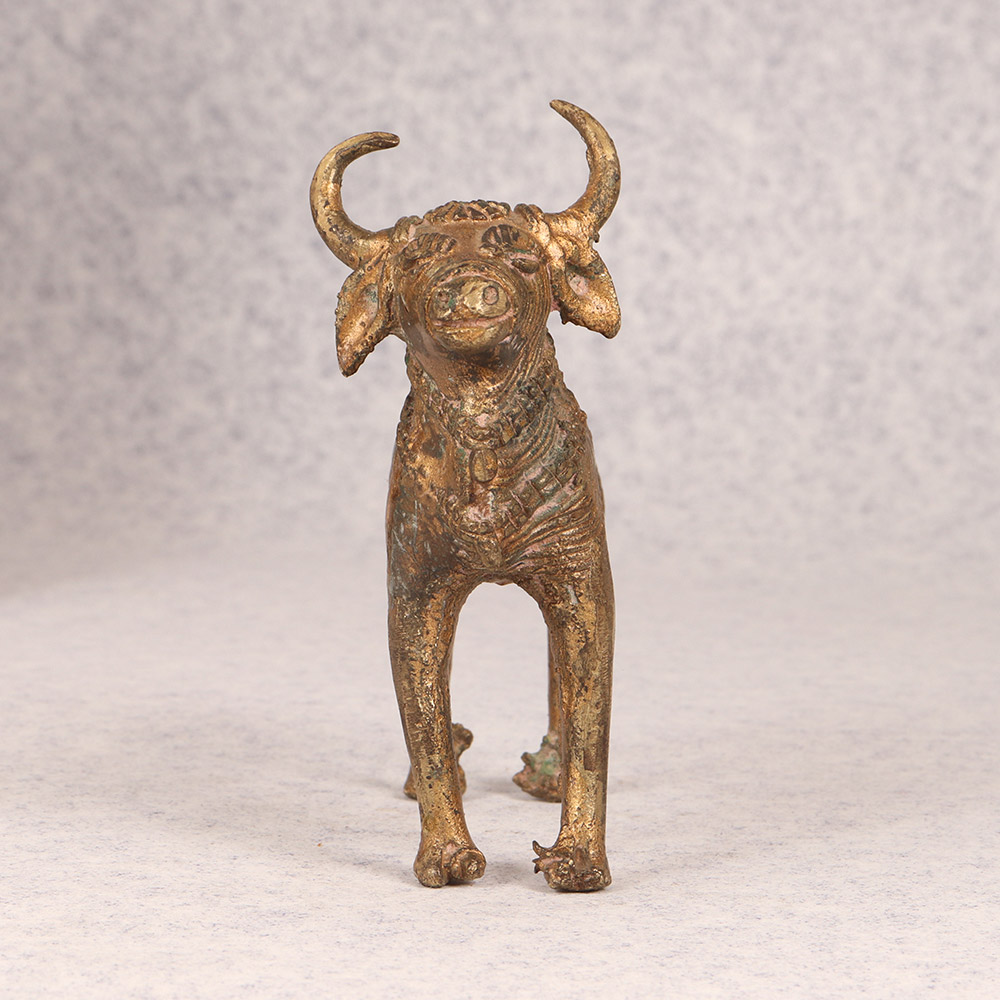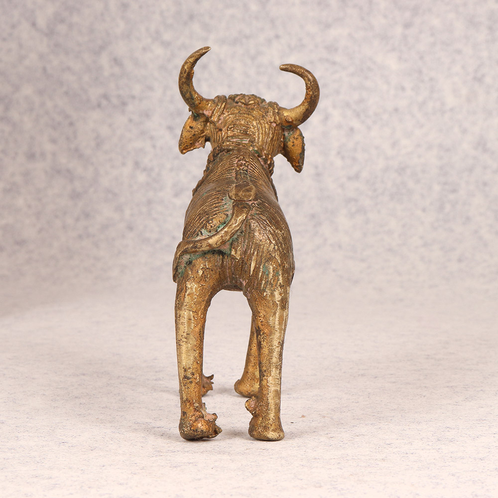 Turn any space into a serene sanctuary with the captivating presence of this vintage brass Nandi statue. Crafted with exquisite attention to detail, this striking piece embodies the rich cultural heritage of tribal art. This stunning Nandi statue is more than just a decorative accent - it's a powerful symbol that can transform the energy of any room. Place it in your meditation corner to cultivate a sense of calm and centeredness. Or let it serve as a stunning focal point, commanding attention and sparking curiosity among your guests. Whether you're a collector of tribal art or simply seeking to infuse your home with natural, grounding elements, this vintage brass Nandi is a must-have. Its timeless beauty and spiritual significance will elevate your living space, reminding you to slow down, find your breath, and connect with something greater than yourself. Invite the essence of ancient tradition into your modern abode with this breathtaking work of art.