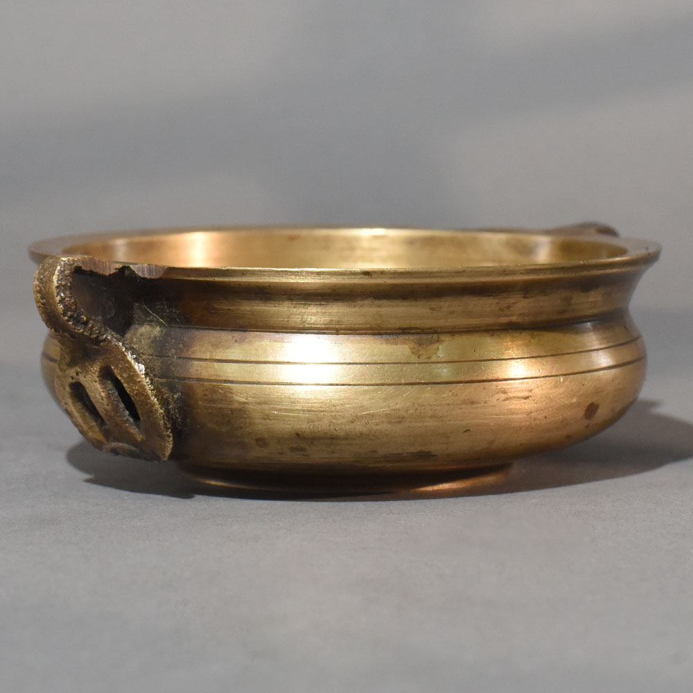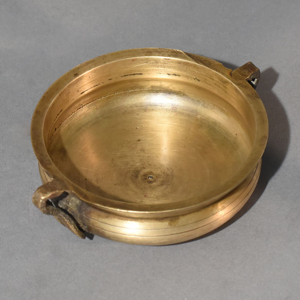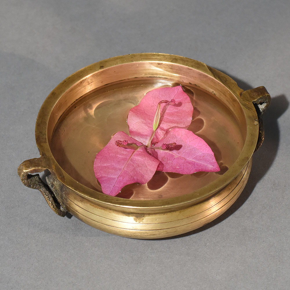 Rooted in Himalayan artistic traditions, this vintage brass Urli pot embodies simplicity, strength, and timeless beauty. Crafted entirely from brass, its broad circular form was historically designed for water-based rituals and floral offerings. The softly curved profile allows flowers to spread evenly across the surface, creating a visually balanced arrangement that feels calm and intentional. The aged brass finish reveals gentle scratches, tonal variations, and darkened areas formed naturally over time. These marks are not flaws but indicators of authenticity, giving the Urli a soulful character impossible to replicate in machine-made decor. The hand-forged side handles add both symmetry and functionality, enhancing its sculptural appeal even when placed empty. Perfect for flower decoration during festivals, weddings, or spiritual gatherings, this Urli also works beautifully as a standalone centerpiece. Placed on a wooden table, stone plinth, or floor setting, it brings a quiet Himalayan elegance into any space. Whether styled minimally with white petals or vibrantly with colorful blossoms, the brass surface enhances the natural beauty of flowers through warm reflection. This Urli is ideal for collectors of antique decor, lovers of traditional Indian craftsmanship, and anyone seeking decor that feels meaningful rather than ornamental.