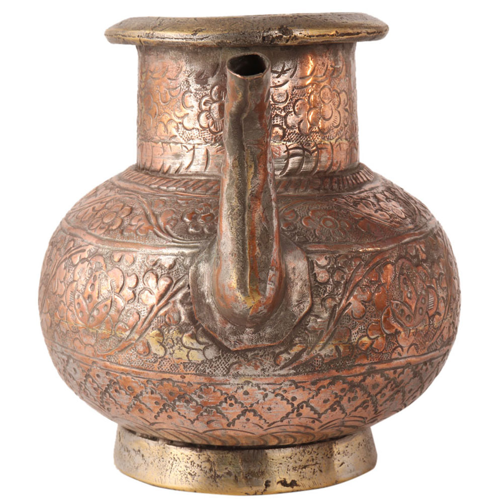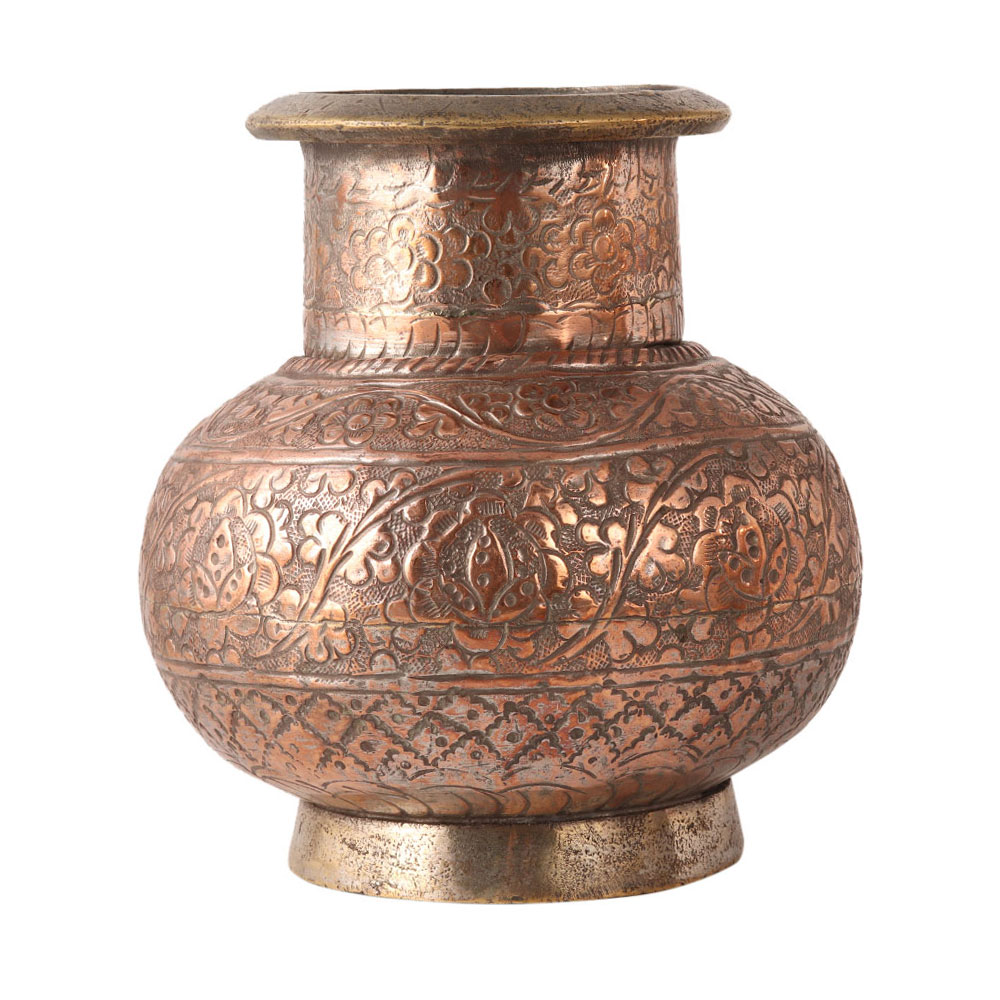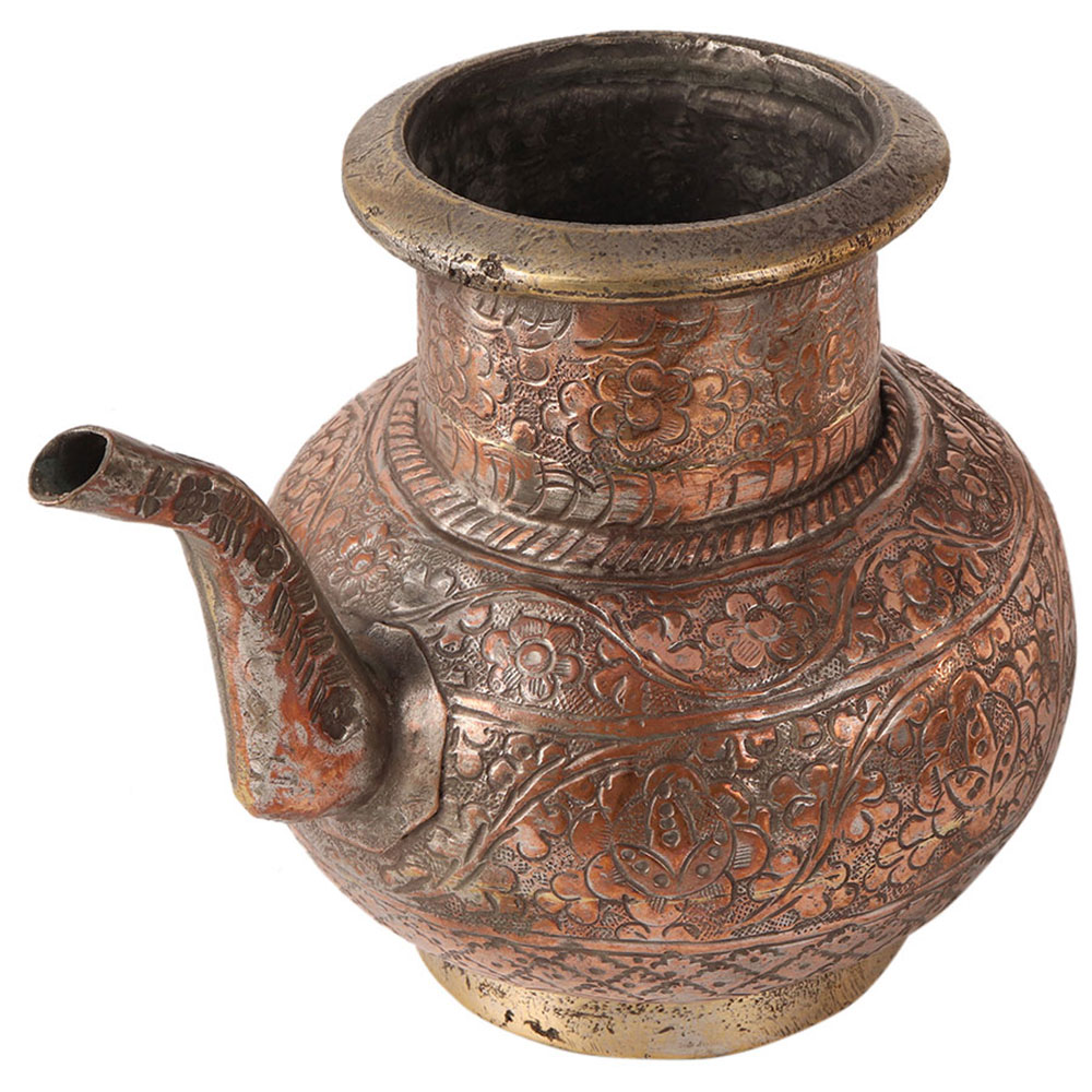 This vintage holy water pot is made of copper. It is handmade by skilled Indian artisans. It has an engraving with floral motifs. It can be given as a gift for birthday, wedding or other occasions.